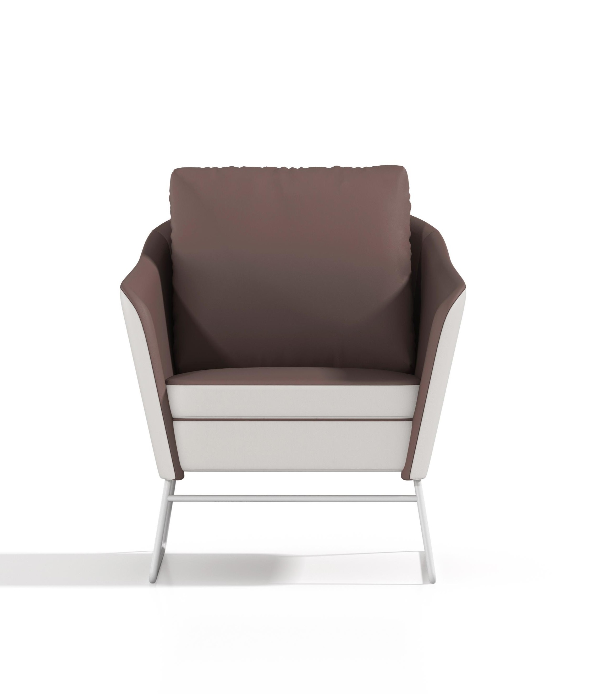 Modern armchair featuring chocolate brown and cream two-tone upholstery, curved silhouette, and sleek chrome wire frame base.