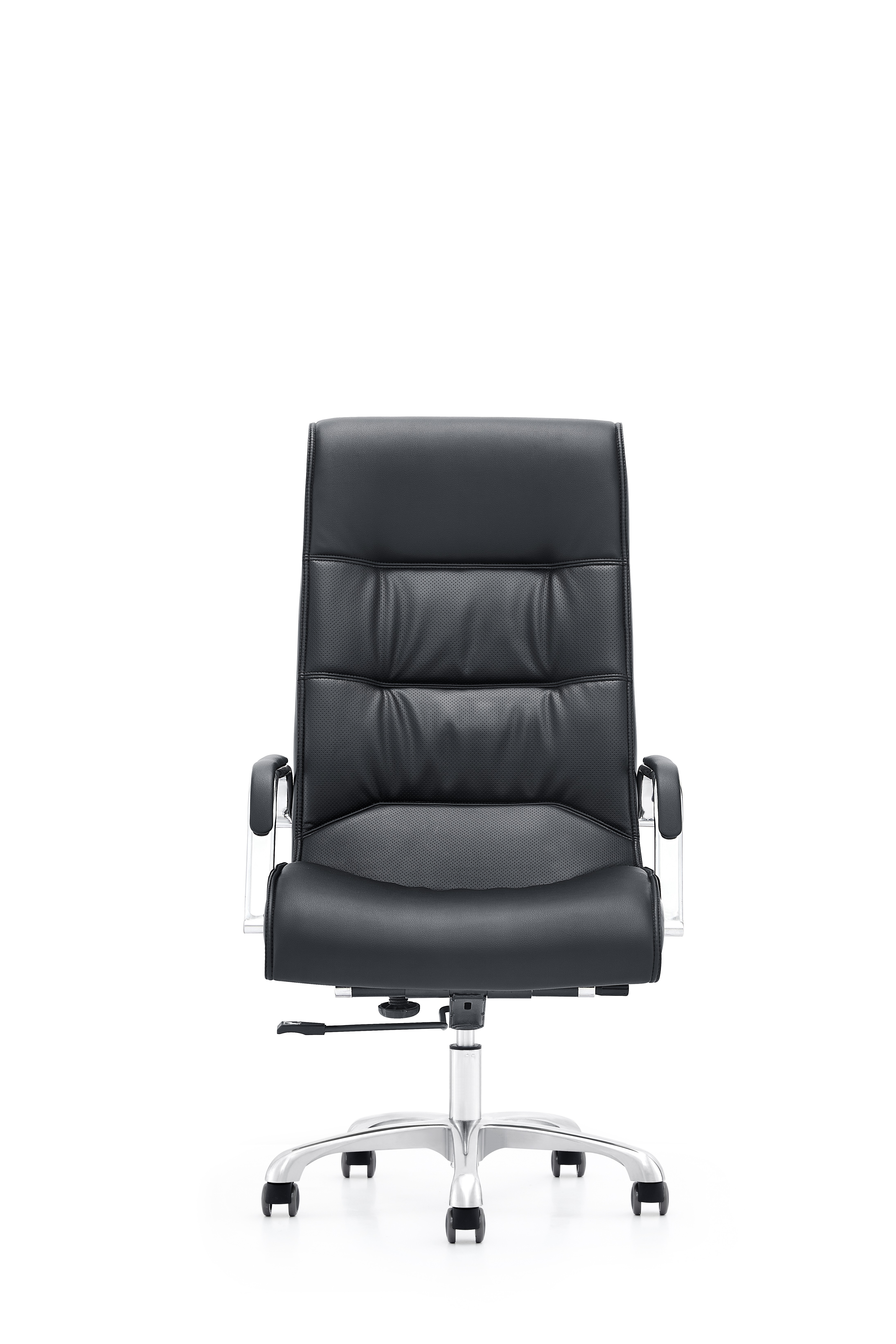 Premium high-back executive chair featuring segmented black leather upholstery, chrome armrests, polished aluminum base, and ergonomic design for executive offices.