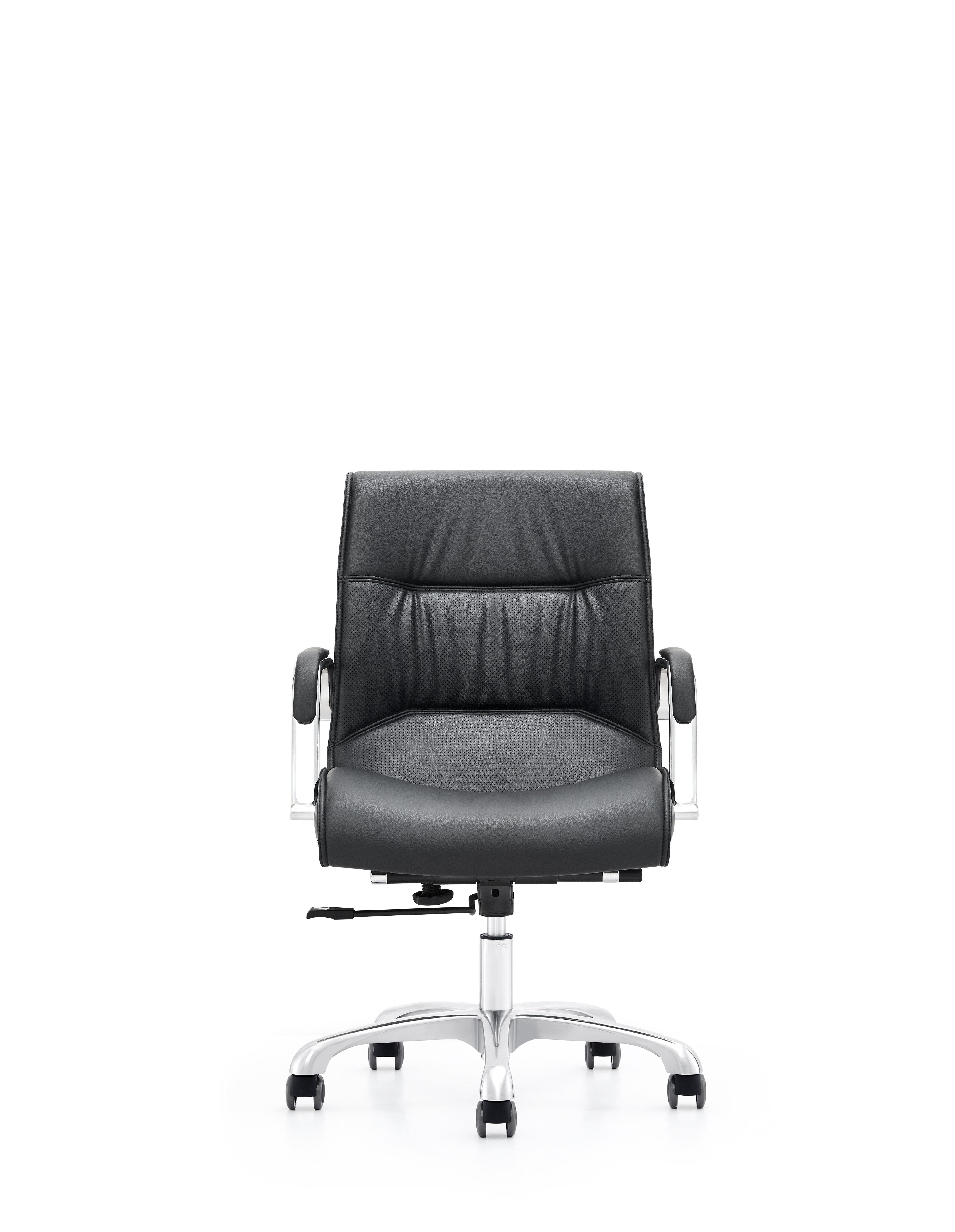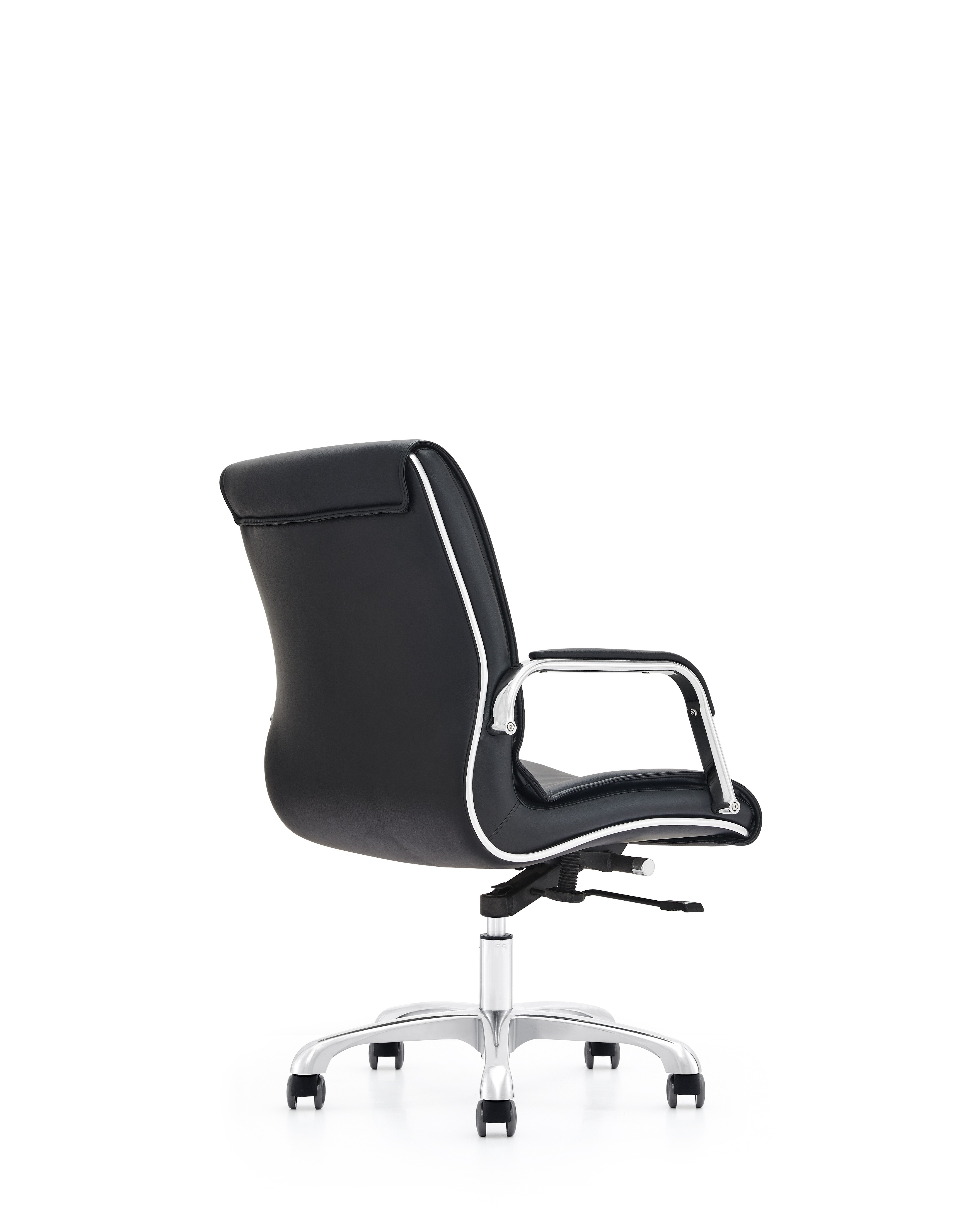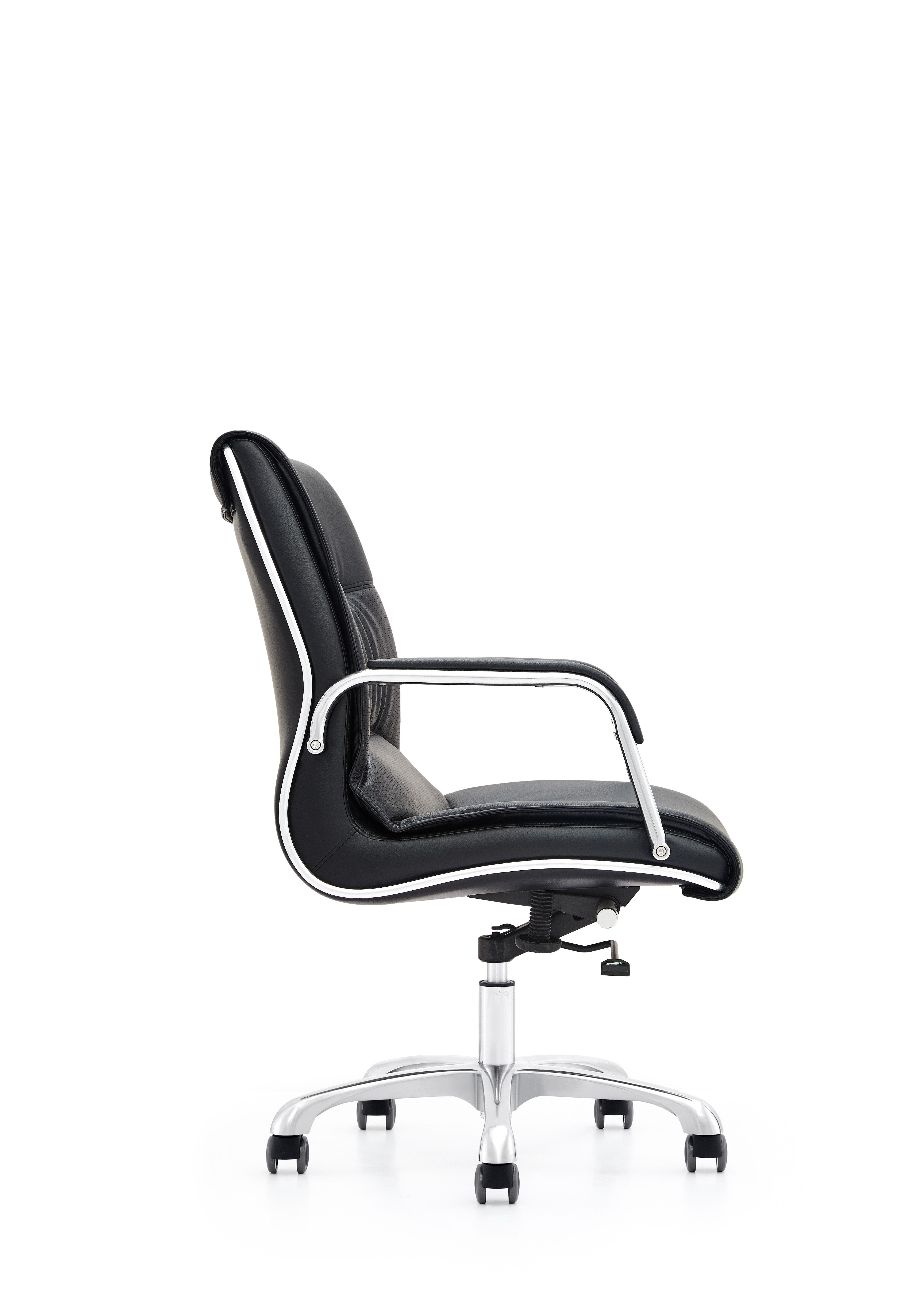 Professional mid-back task chair featuring black leather upholstery, chrome cantilever armrests, polished aluminum base, and ergonomic design for workstations.