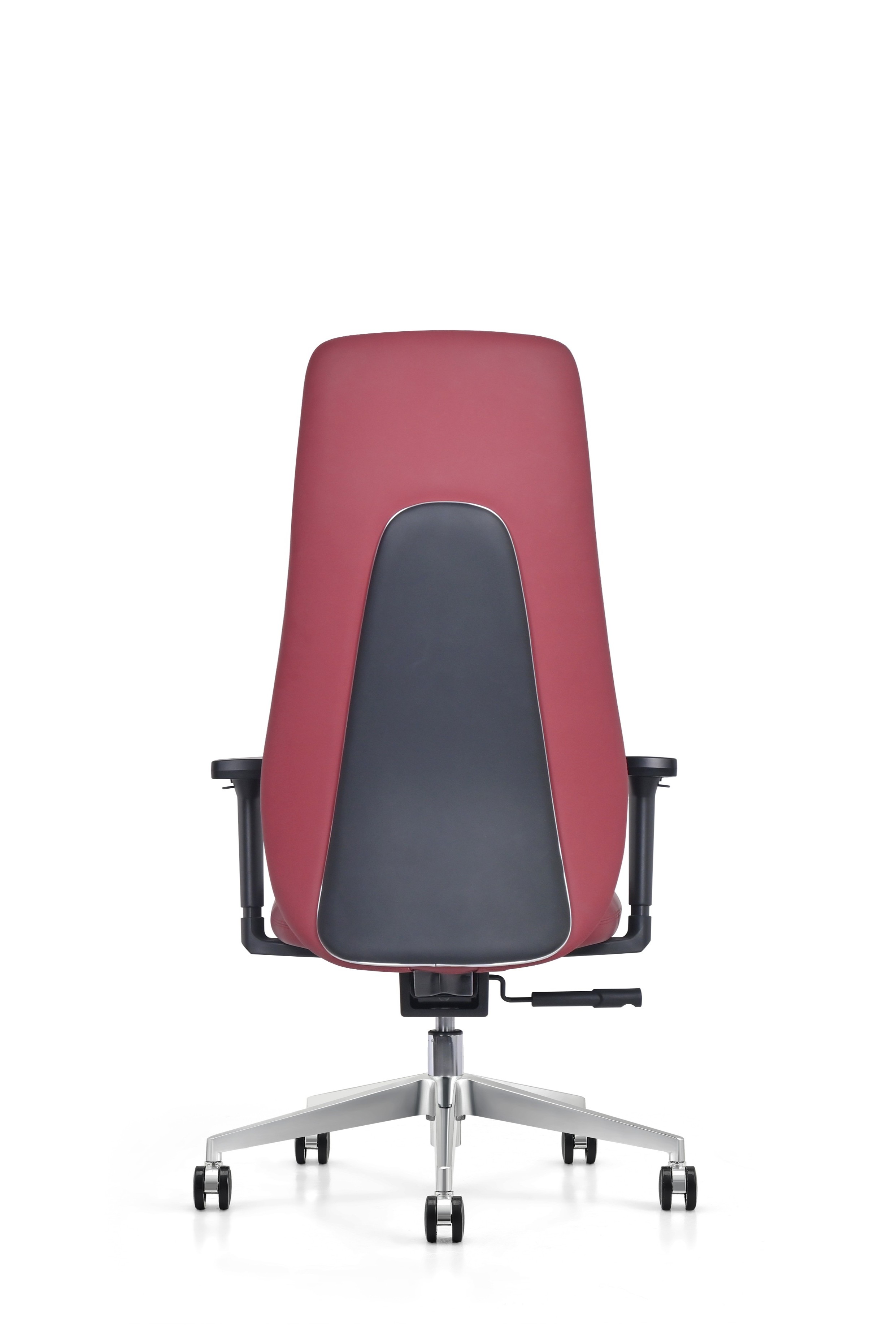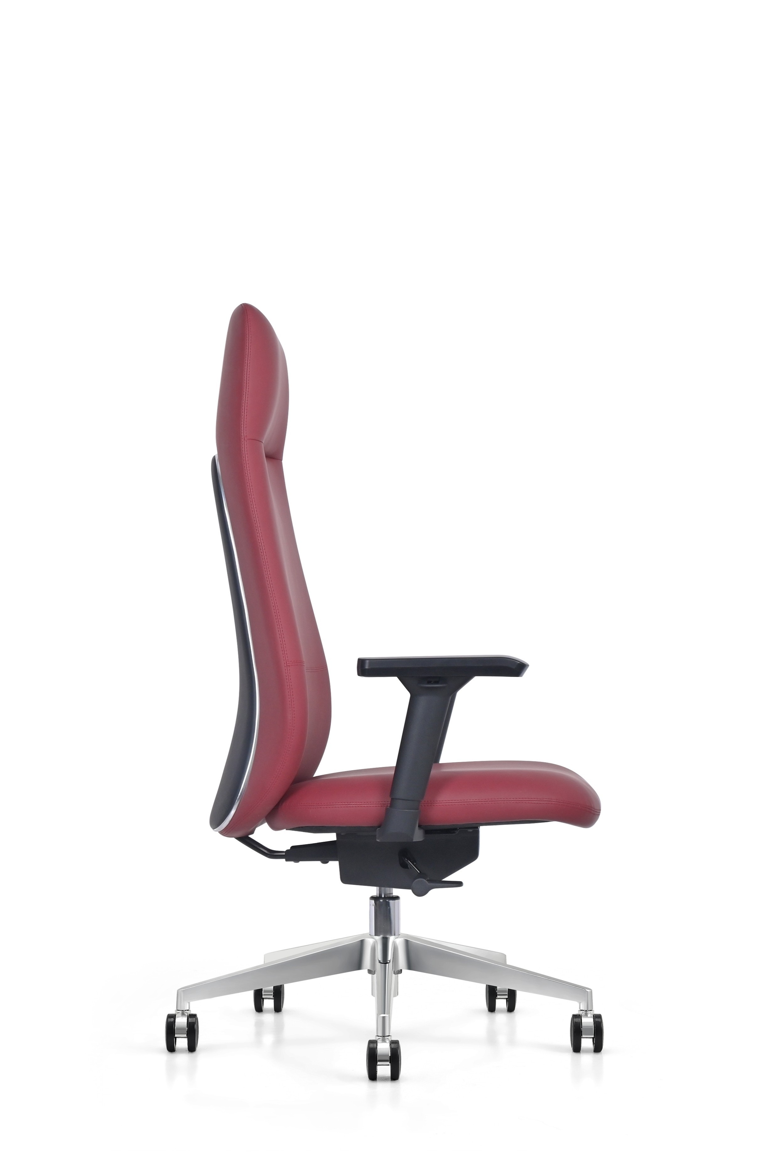 Premium high-back executive chair featuring red upholstery, black adjustable armrests, polished aluminum base, and ergonomic design for executive offices.