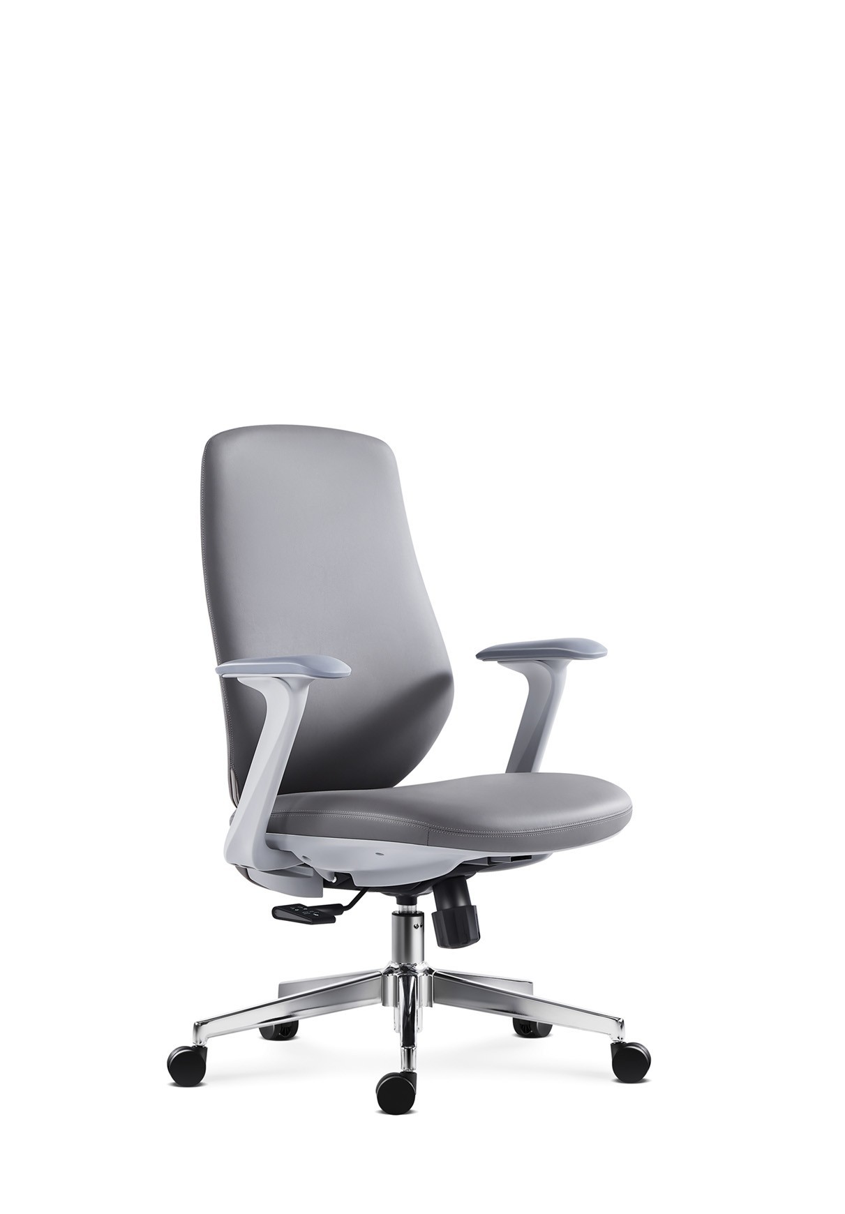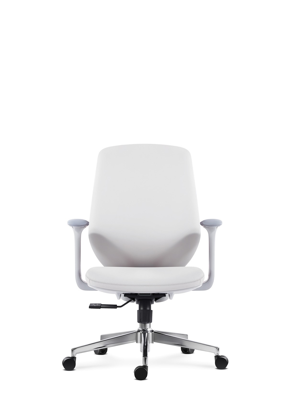 Professional task chair featuring leather upholstery, mid-back design, white adjustable armrests, chrome base, and ergonomic comfort features.