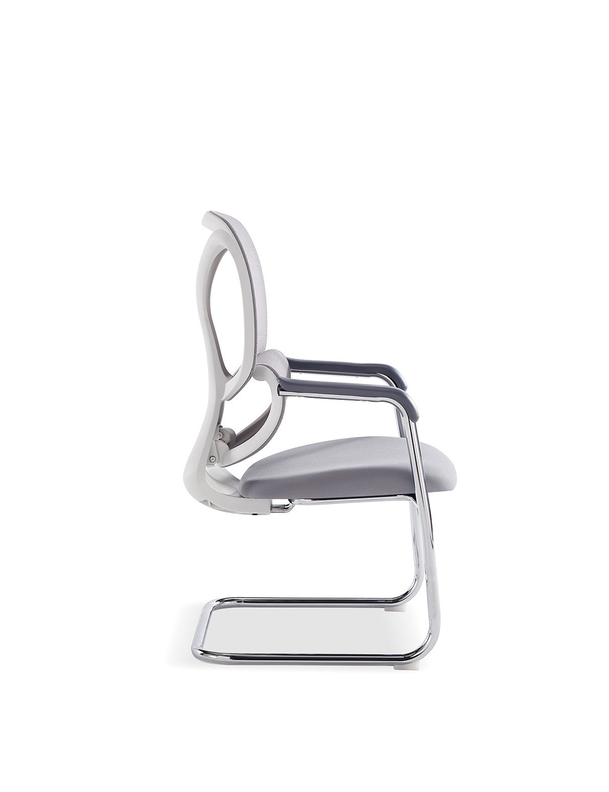 Stylish cantilever guest chair with breathable mesh back, chrome steel frame, padded seat, fixed armrests, and stationary base for visitor seating.