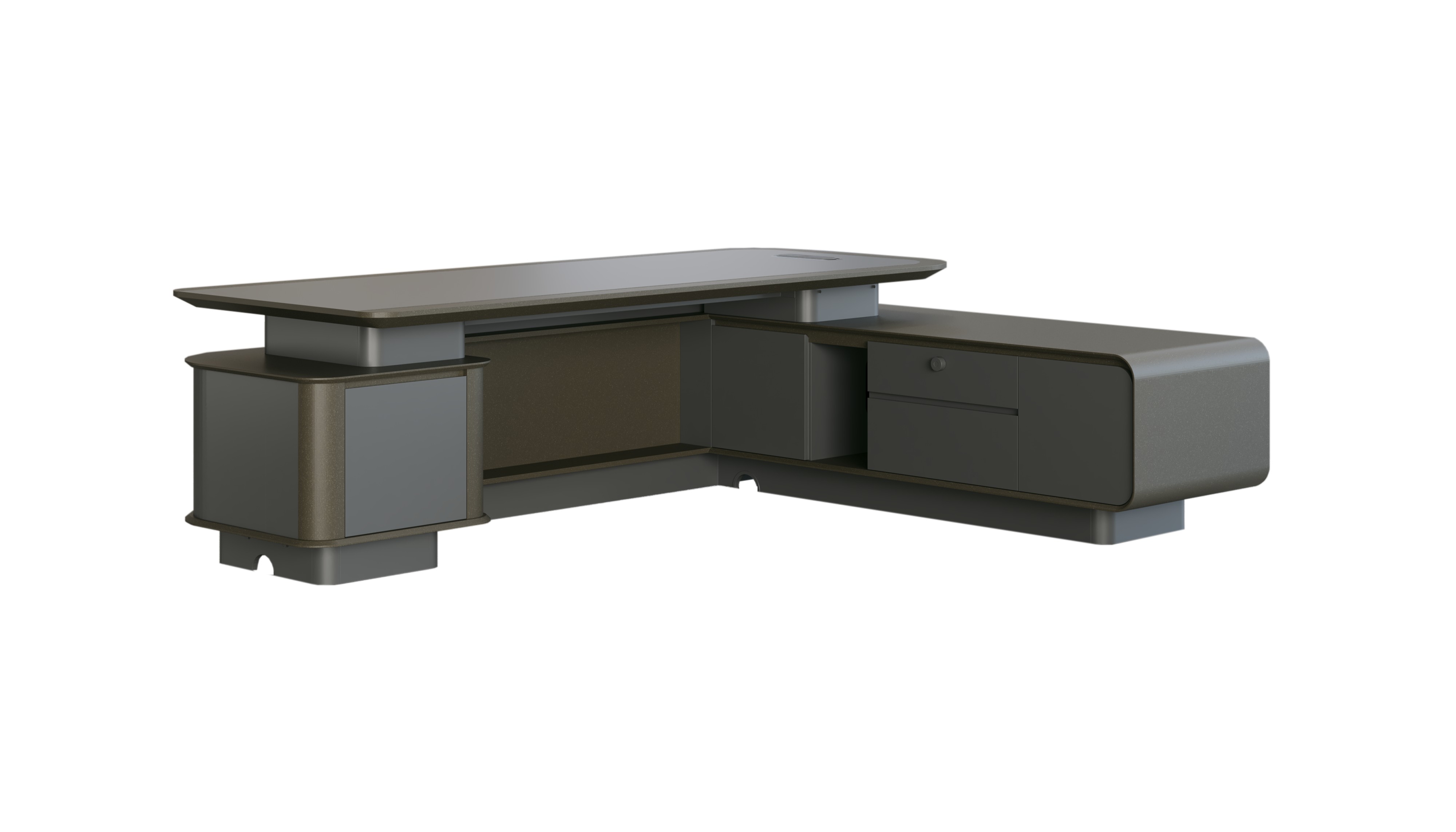 Premium L-shaped executive desk with dual pedestals, curved design, integrated storage compartments, and sophisticated gray professional finish.