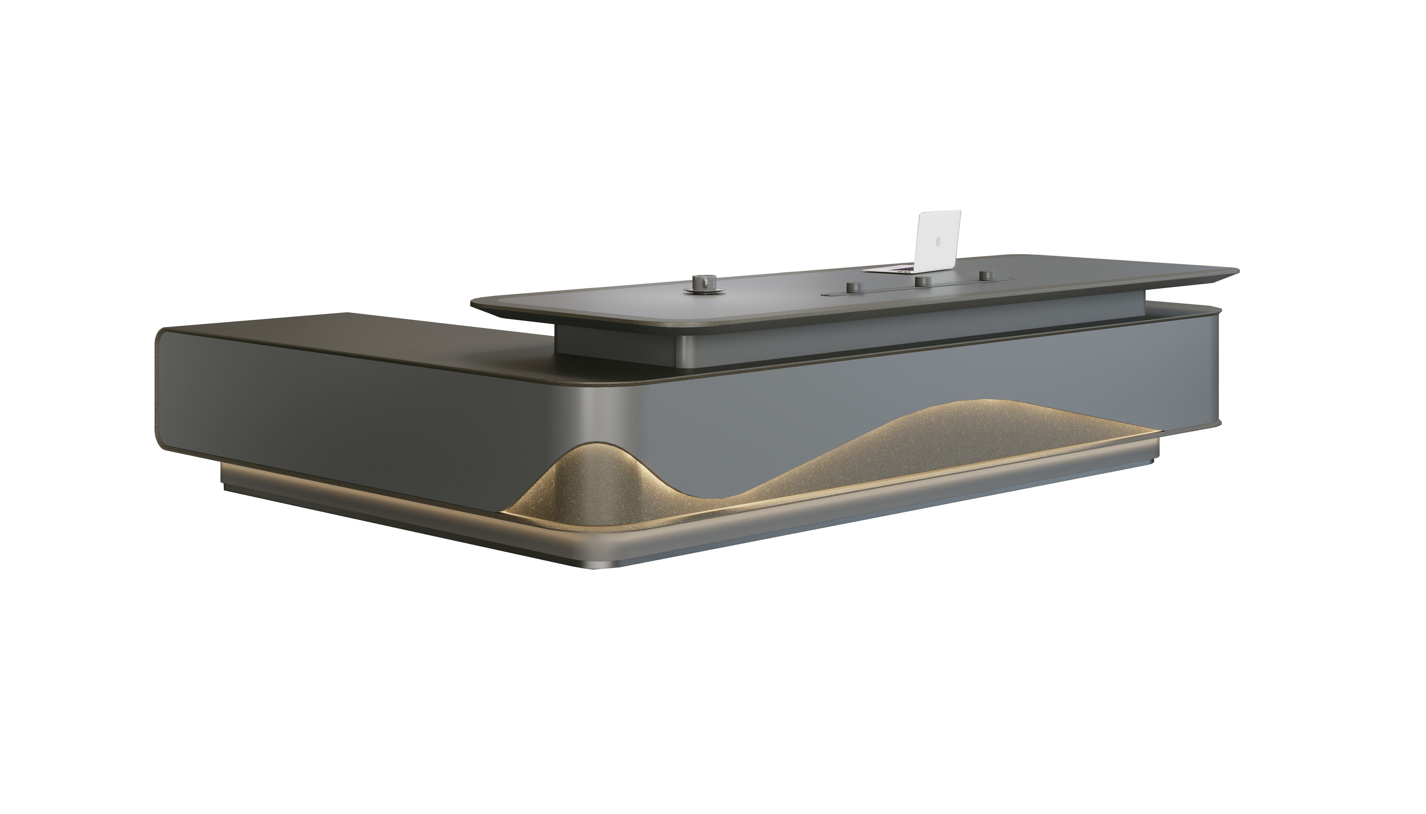 Premium L-shaped executive desk with dual pedestals, curved design, integrated storage compartments, and sophisticated gray professional finish.