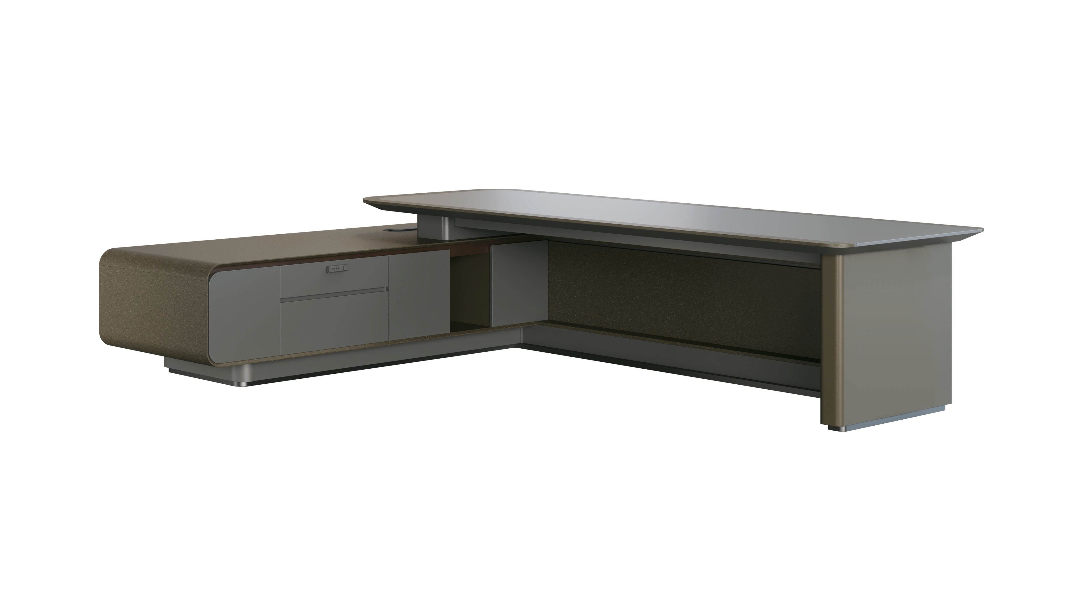 Premium L-shaped executive desk with dual pedestals, curved design, integrated storage compartments, and sophisticated gray professional finish.
