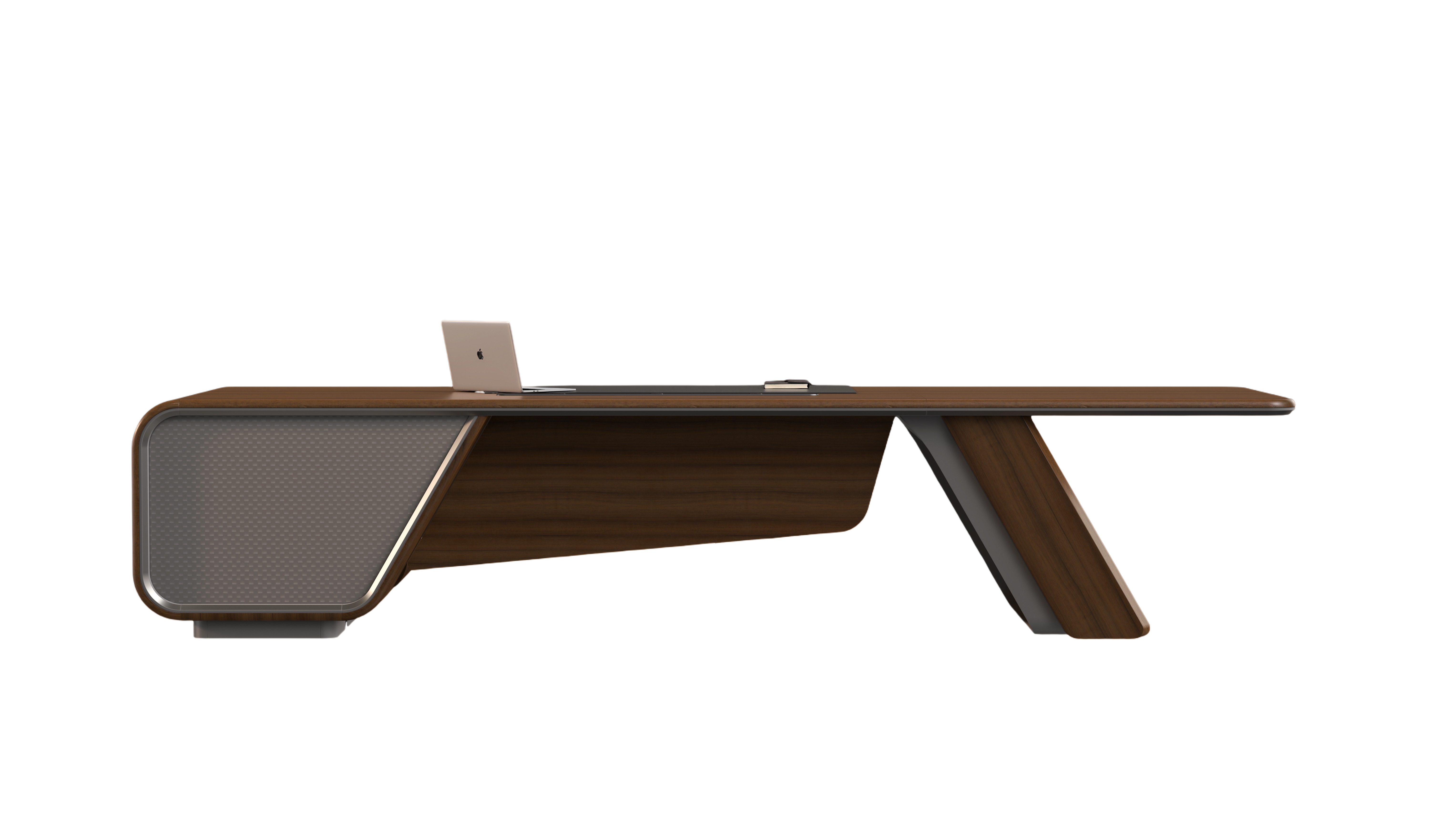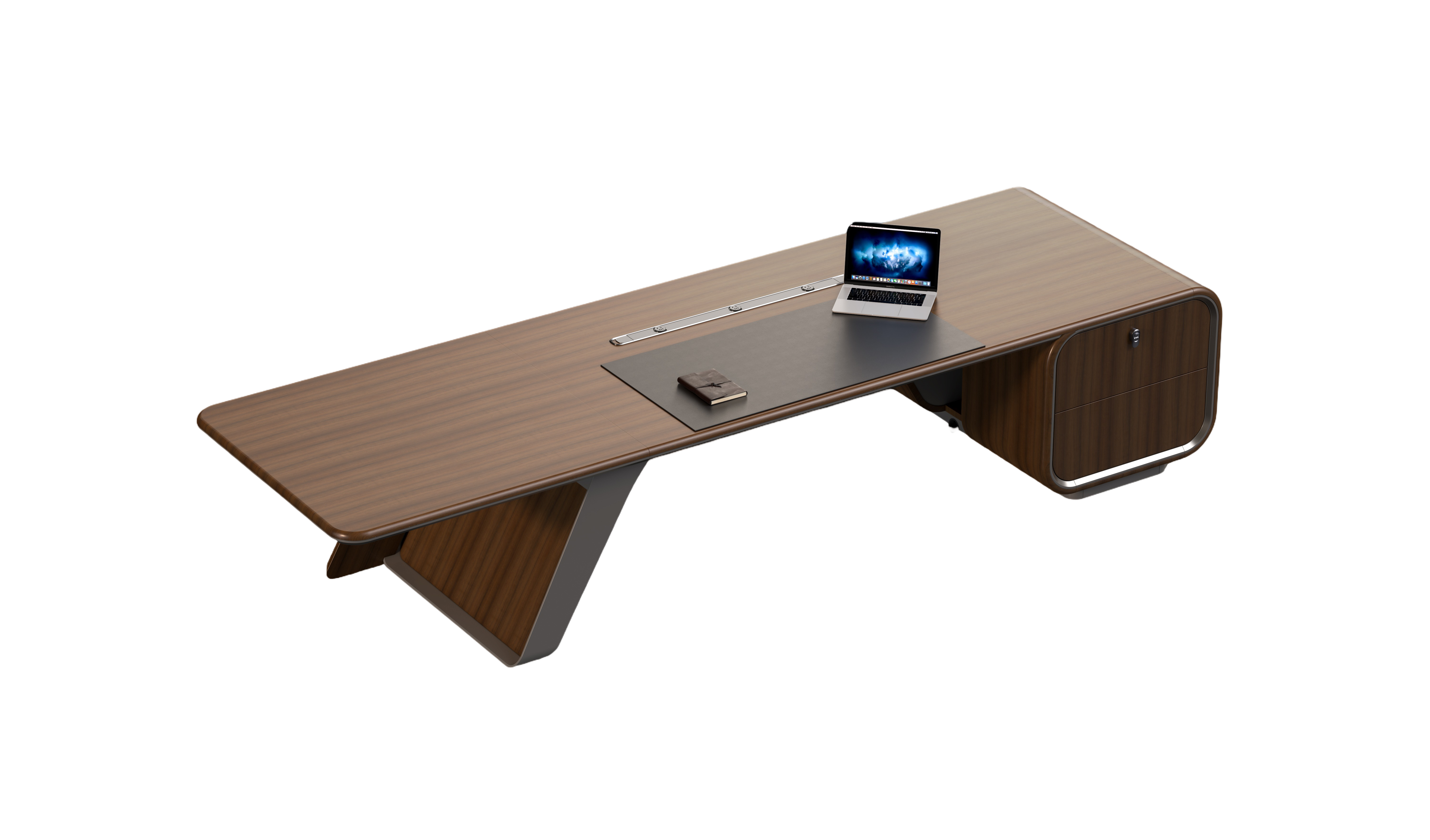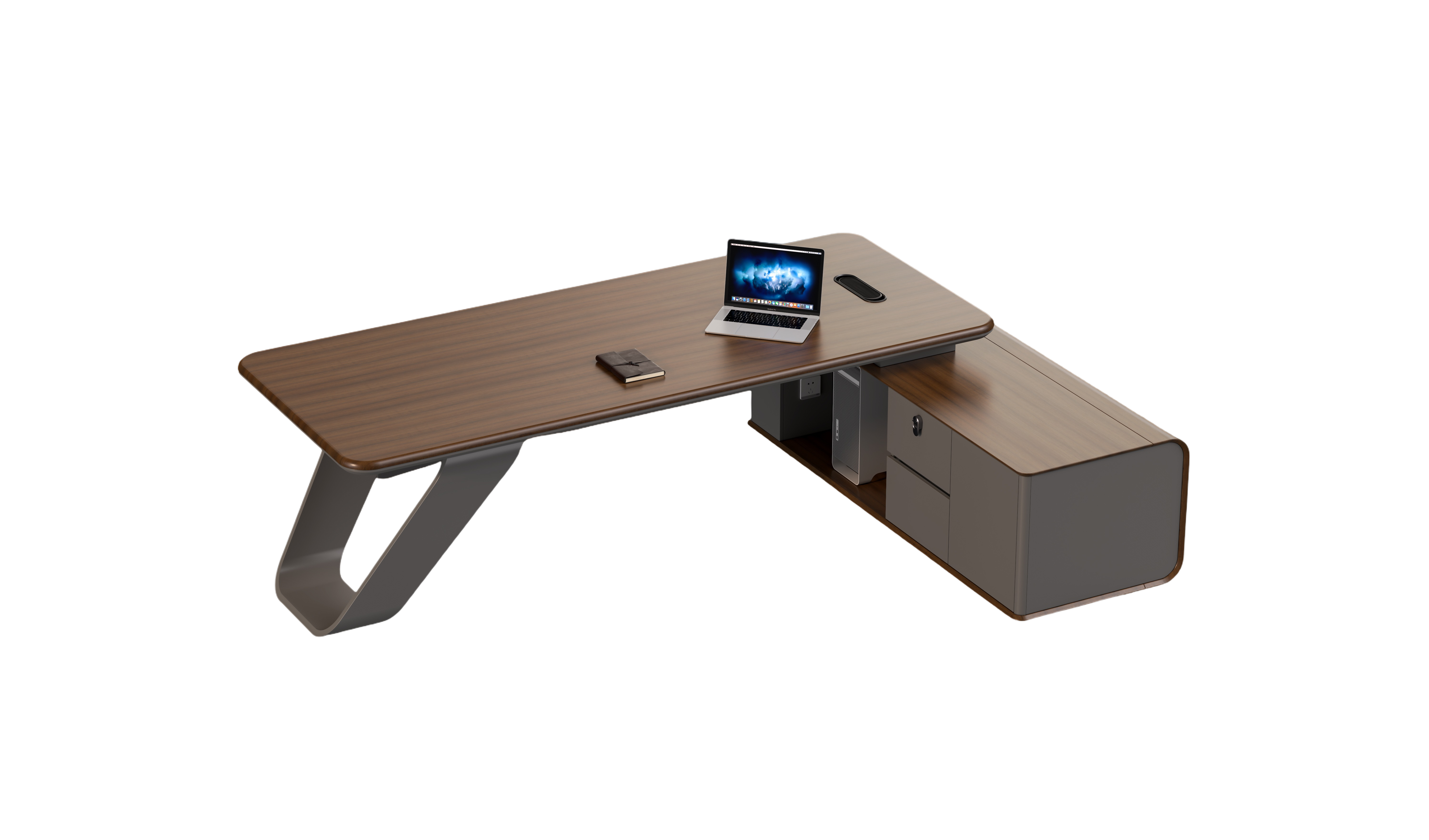 Modern executive L-shaped desk featuring distinctive angular metal legs, integrated storage credenza, and rich walnut finish design.