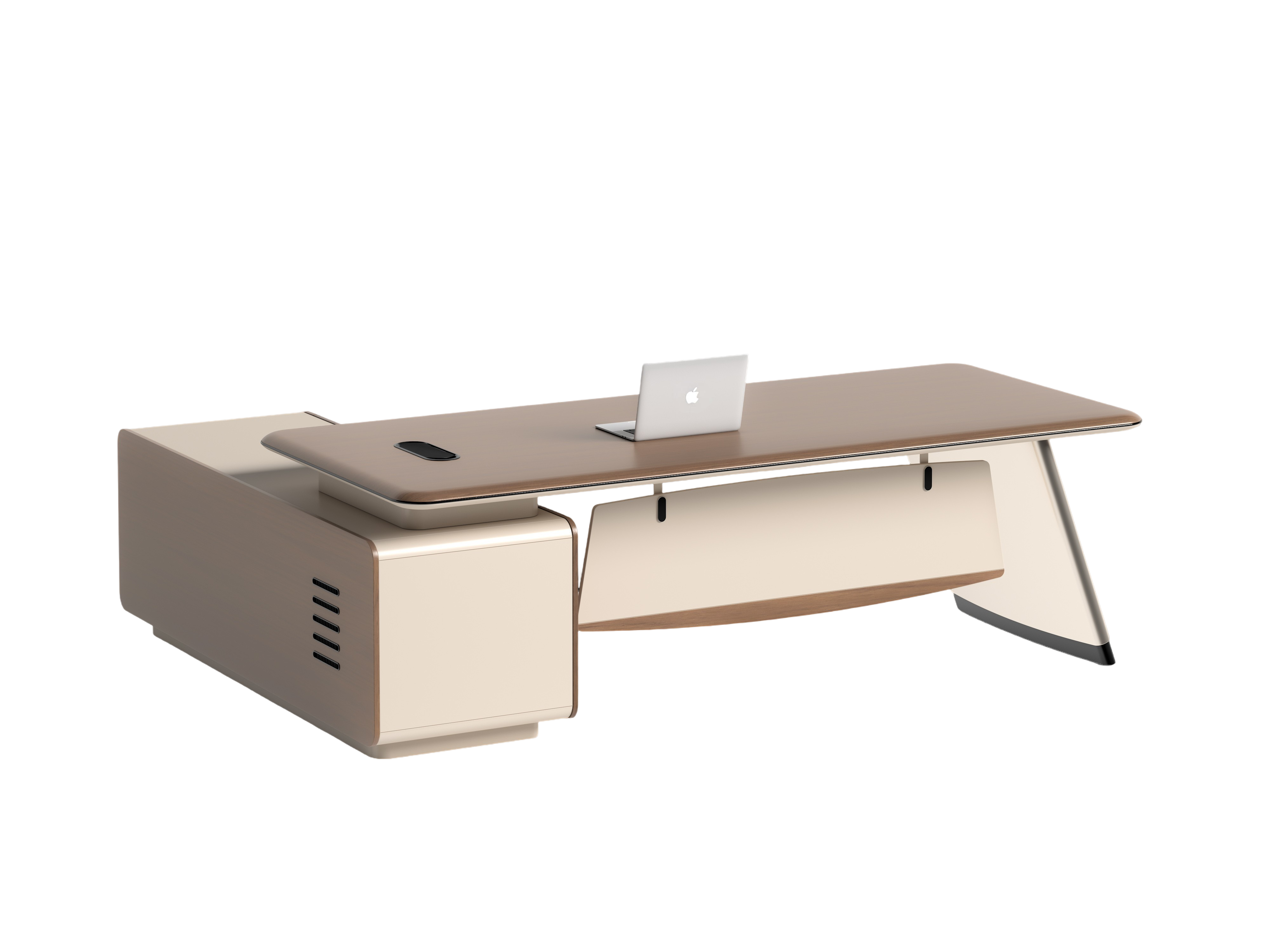 Contemporary executive L-shaped desk with curved design, integrated storage cabinet, premium finish, and spacious work surface for executive offices.
