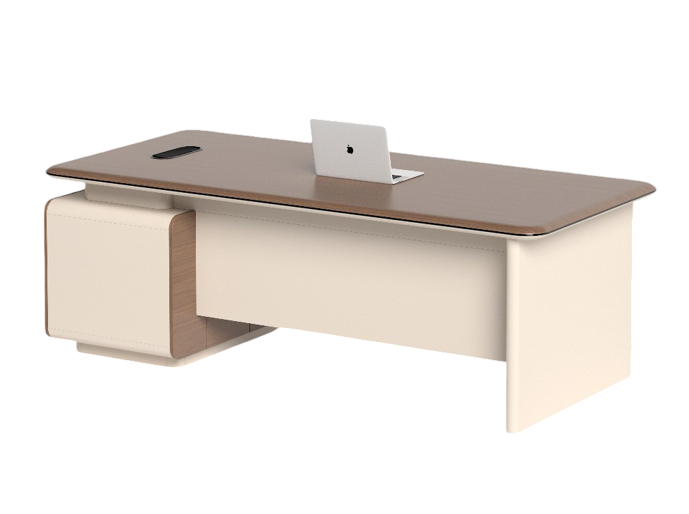 Professional executive desk with integrated side pedestal, spacious work surface, built-in storage drawers, and modern two-tone finish design.