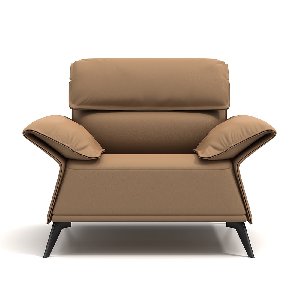 Modern camel leather sofa featuring distinctive adjustable wing armrests, layered back cushions, and sleek black legs for luxury comfort.