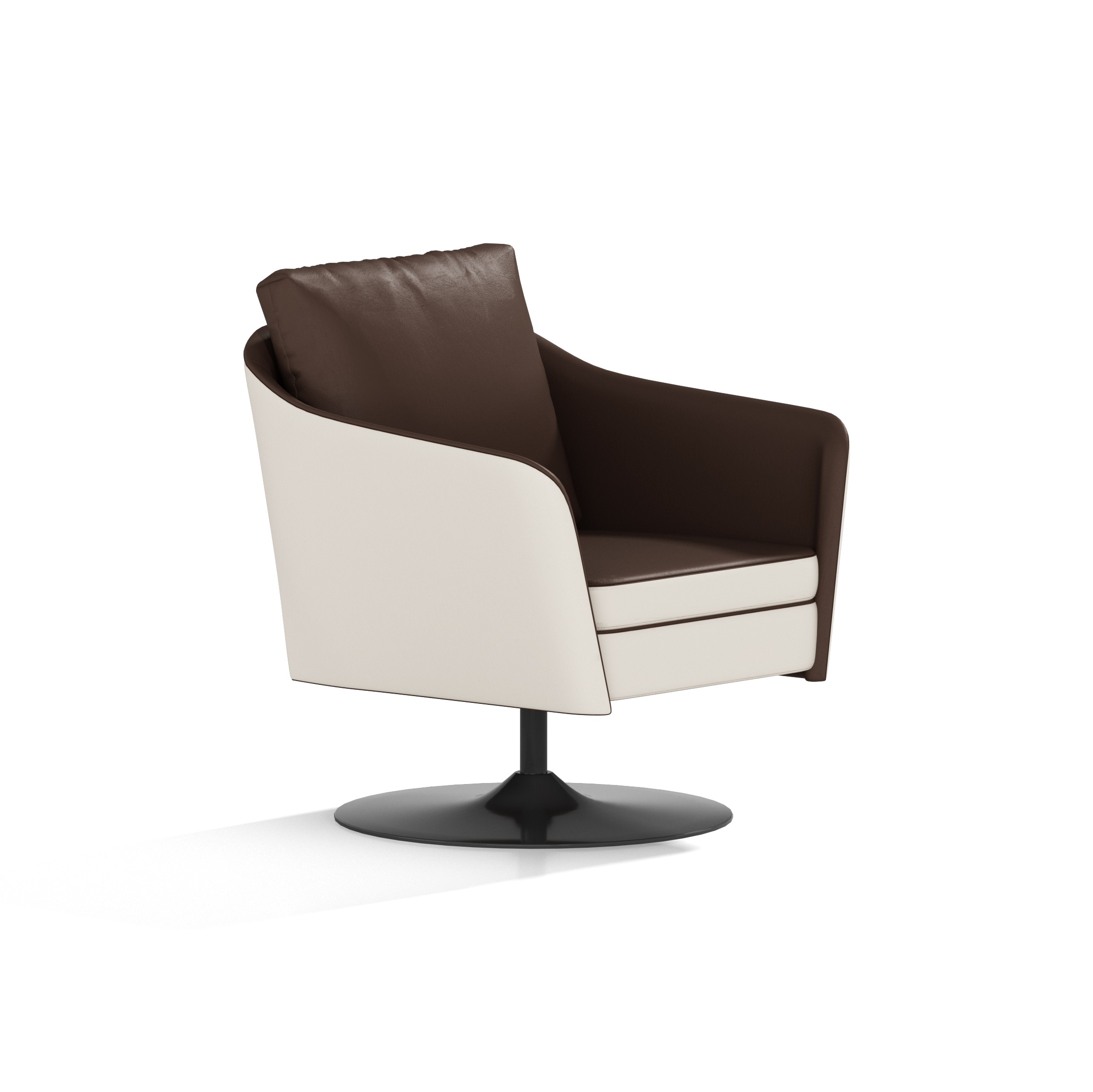 Modern swivel armchair featuring chocolate brown and cream two-tone upholstery, curved silhouette, and sleek black trumpet pedestal base.