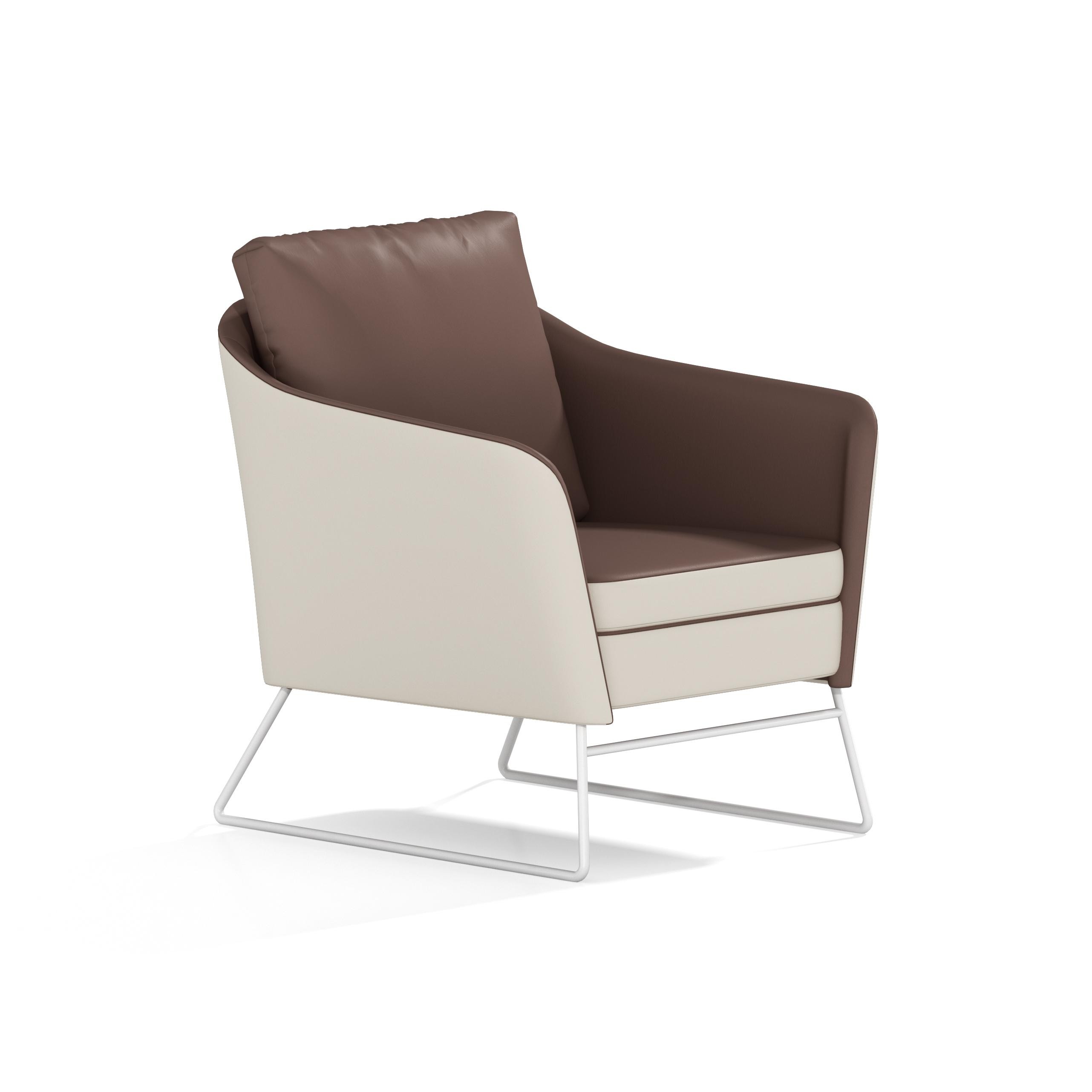 Modern armchair featuring chocolate brown and cream two-tone upholstery, curved silhouette, and sleek chrome wire frame base.