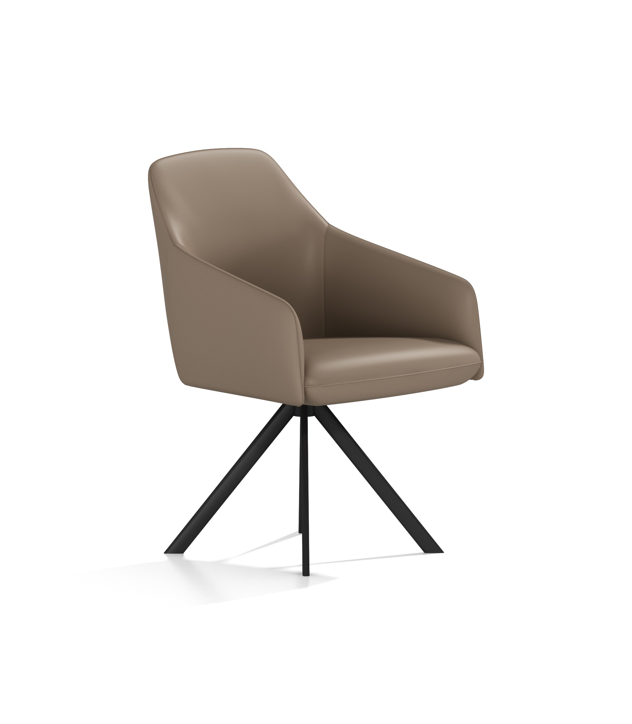 Modern swivel armchair featuring premium taupe leather upholstery with sleek curved silhouette and black steel pyramid base.