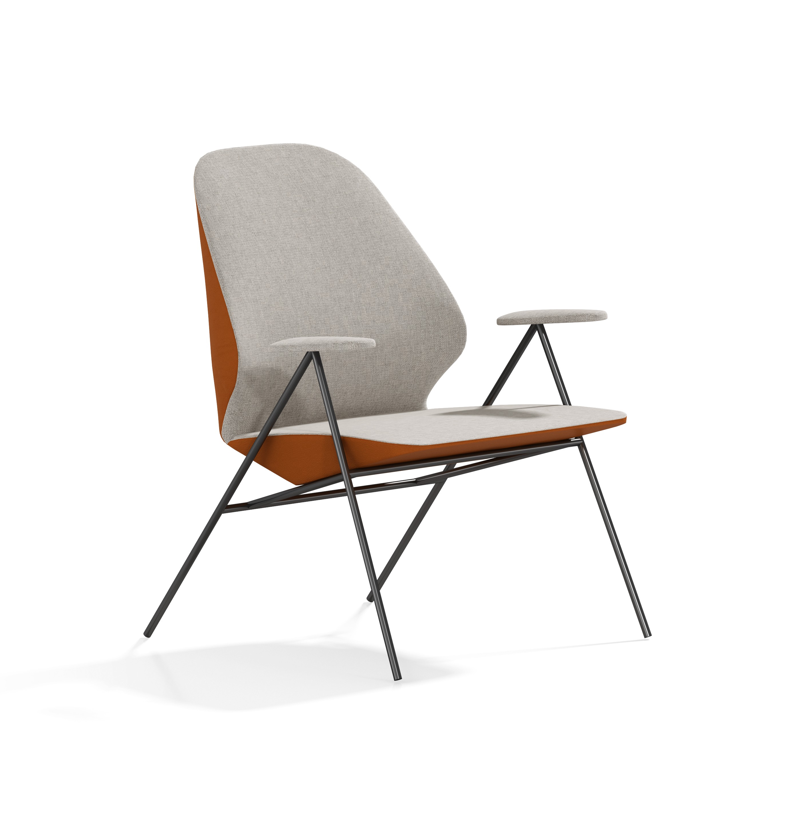 Retro-inspired lounge chair featuring light grey upholstery, warm wood seat detail, and black steel wire frame base.