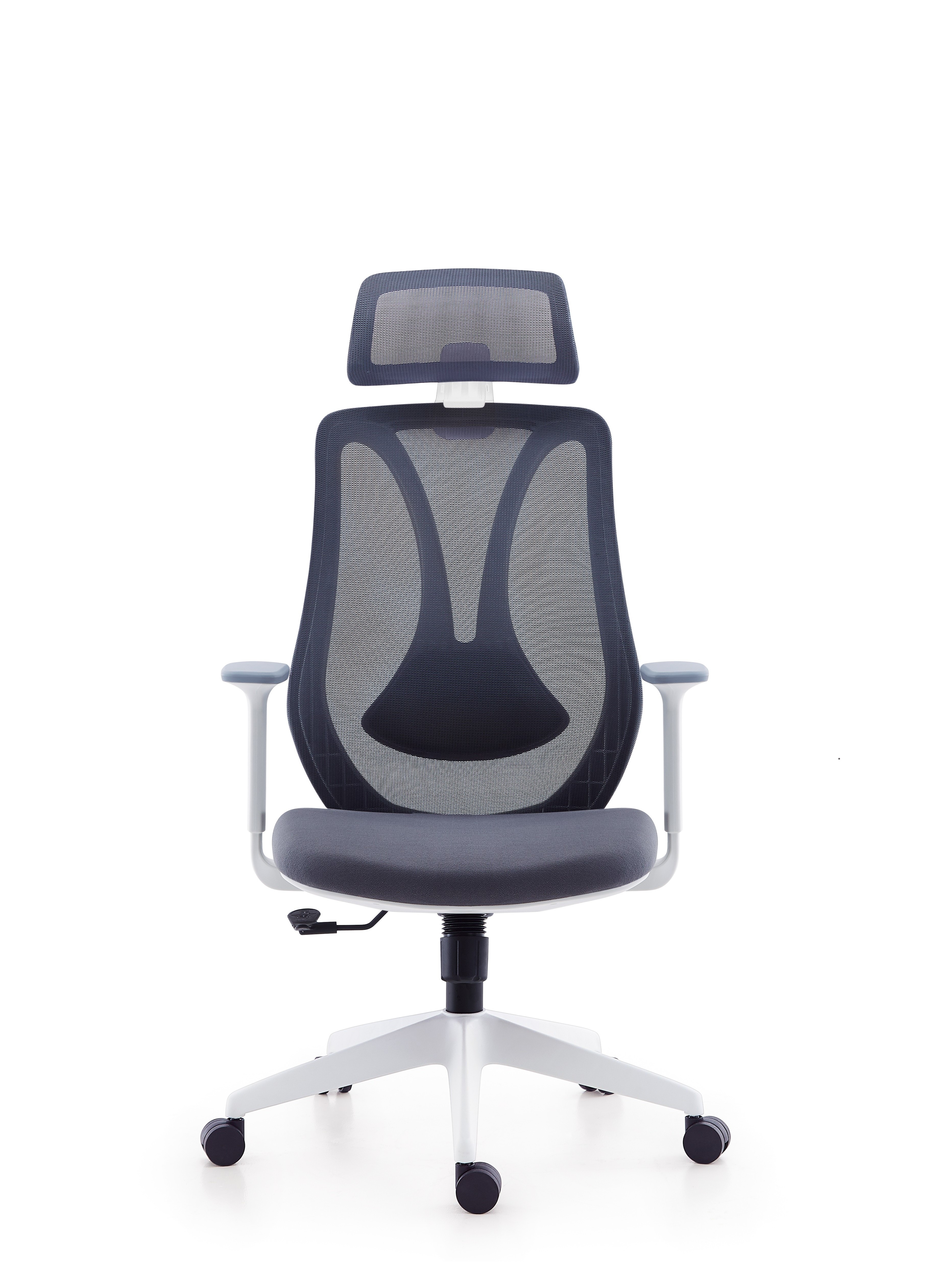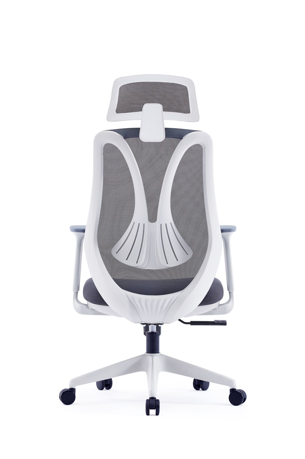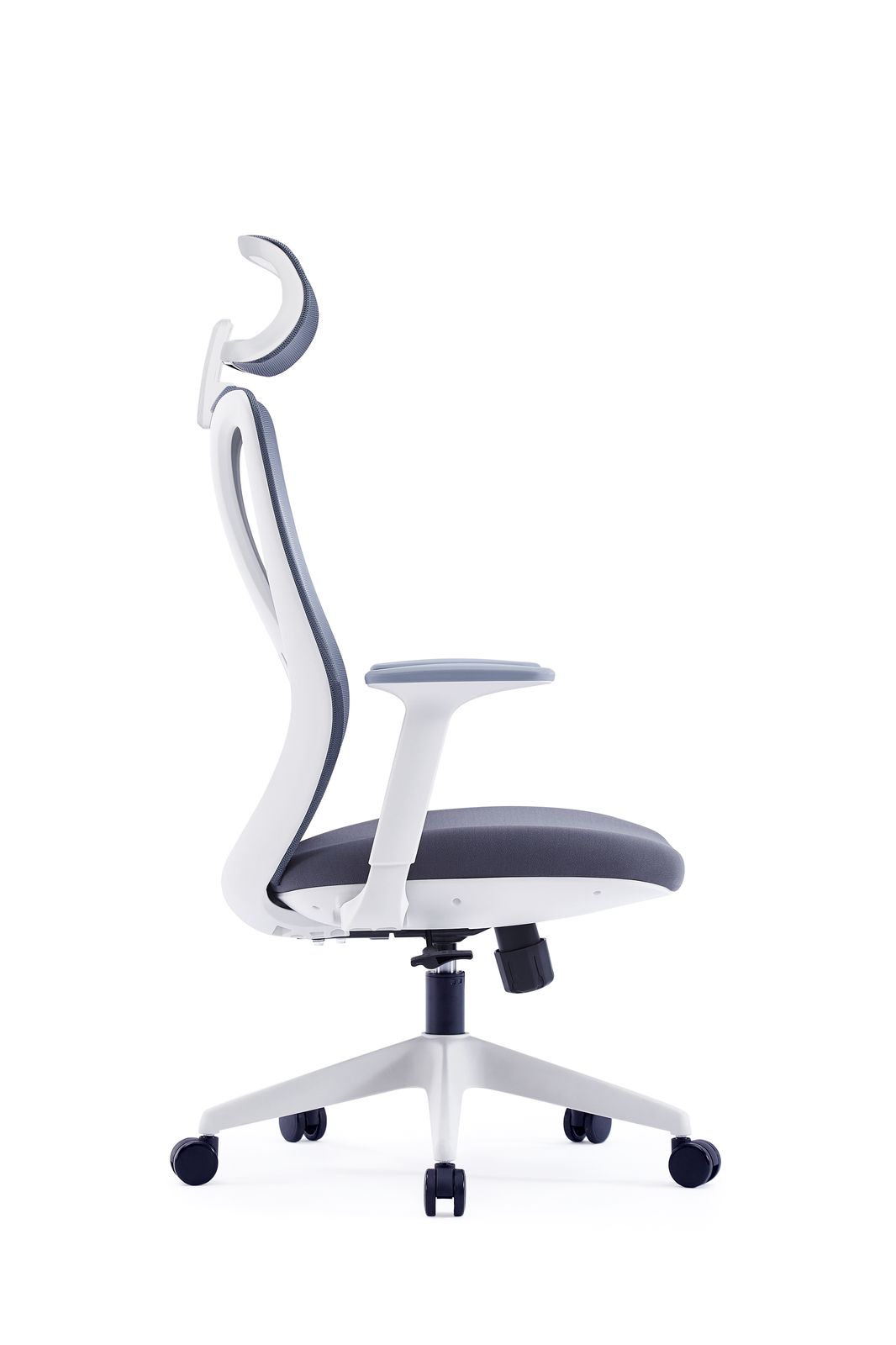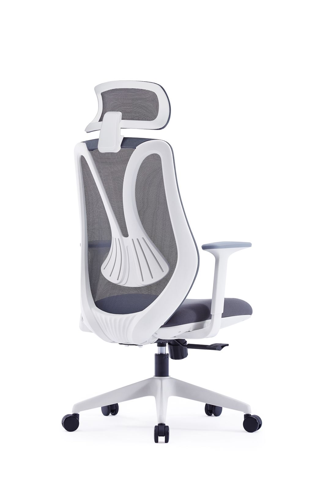 Premium high-back executive chair featuring adjustable headrest, breathable mesh design, and elegant white accents for superior comfort and professional style.