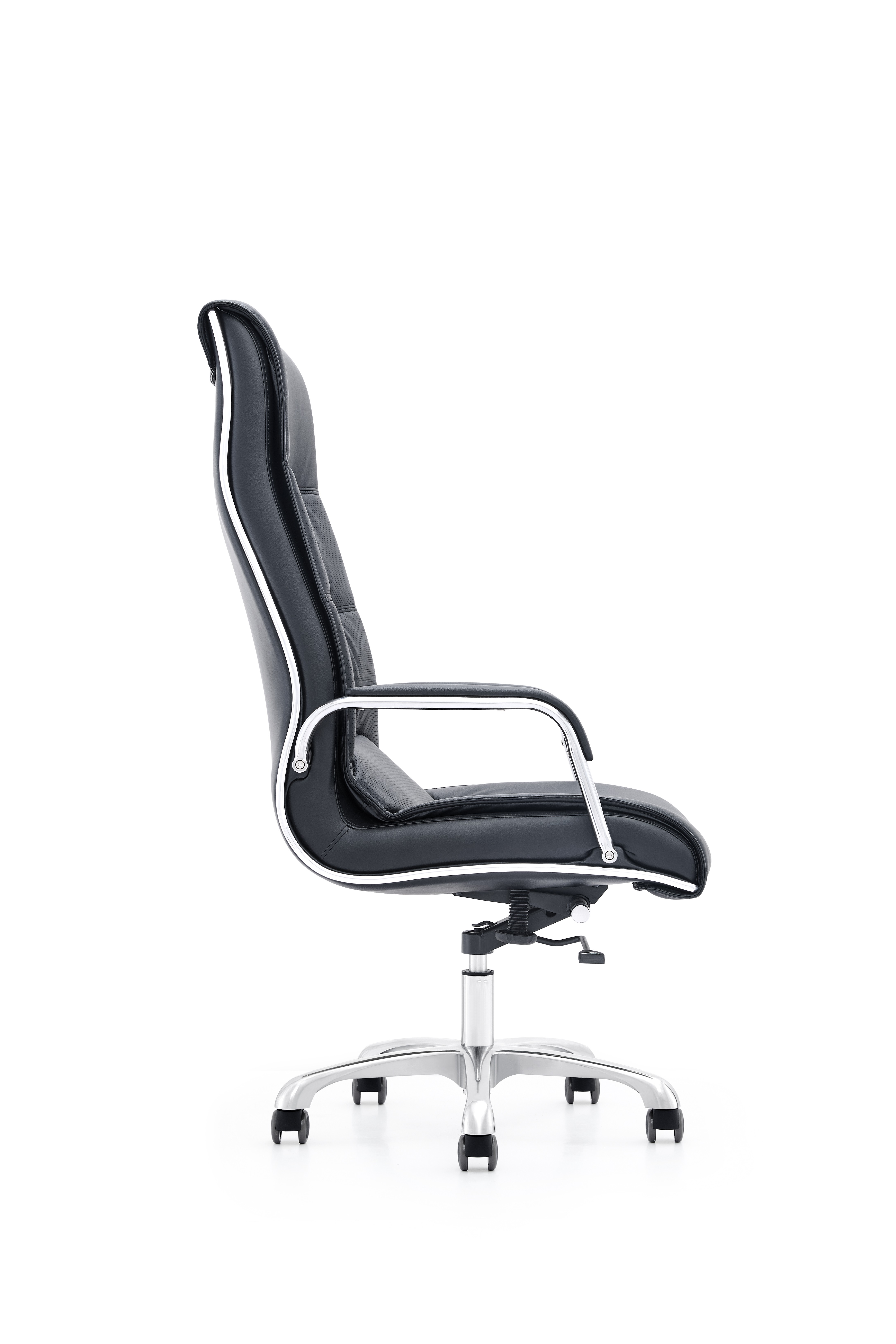 Premium high-back executive chair featuring segmented black leather upholstery, chrome armrests, polished aluminum base, and ergonomic design for executive offices.
