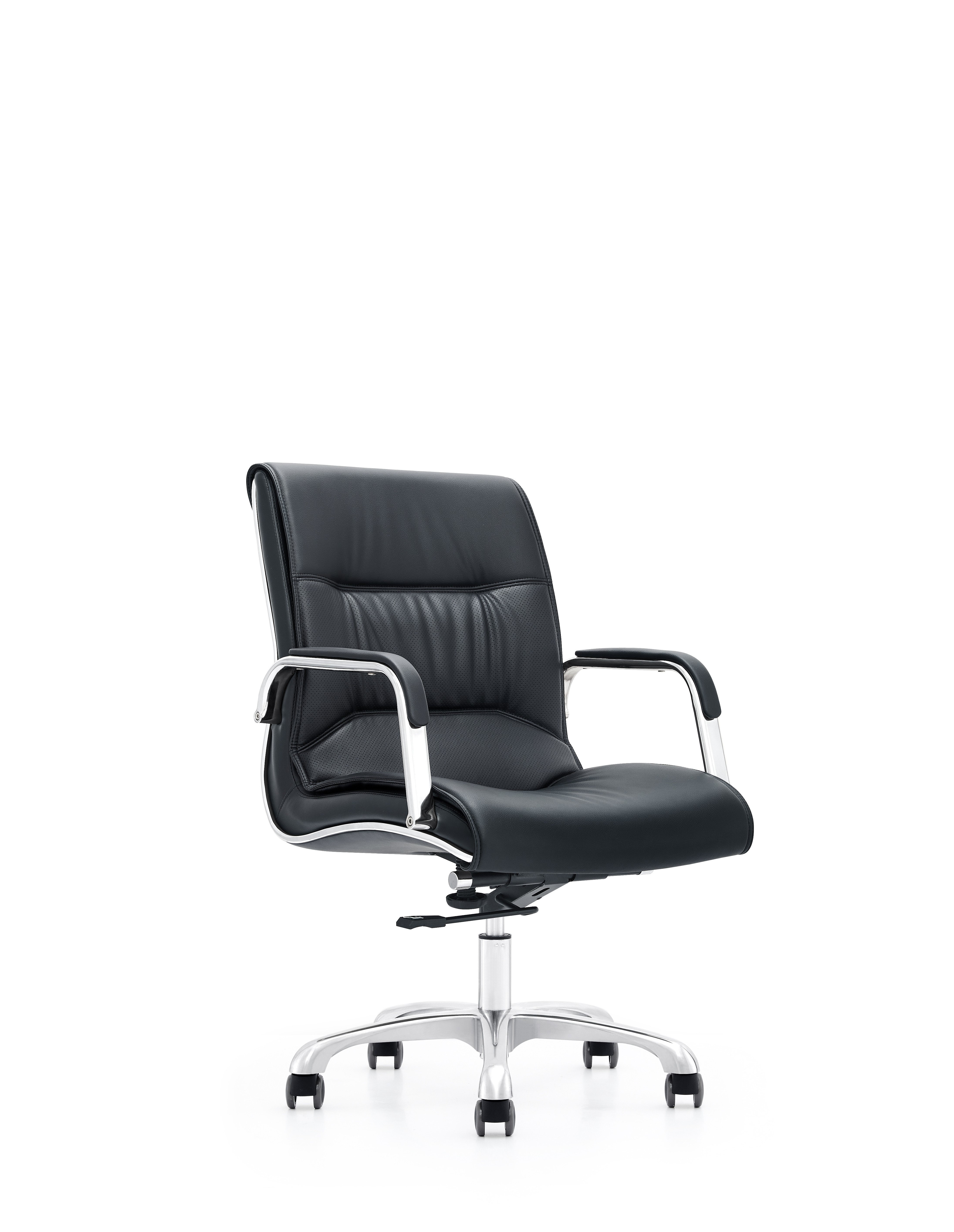 Professional mid-back task chair featuring black leather upholstery, chrome cantilever armrests, polished aluminum base, and ergonomic design for workstations.