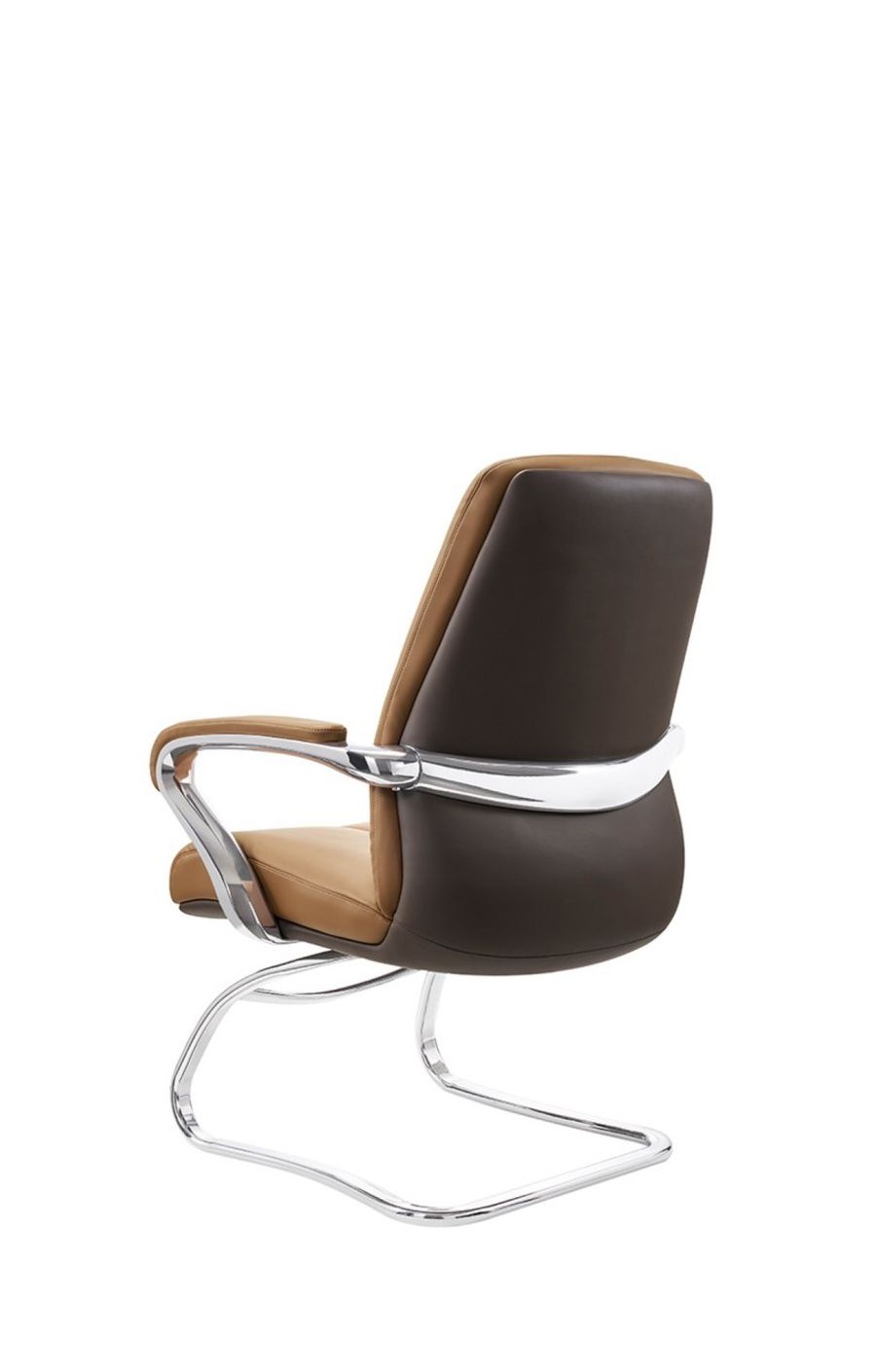 Contemporary mid-back guest chair featuring tan leather upholstery, chrome armrests, cantilever base design, and ergonomic comfort for visitors.