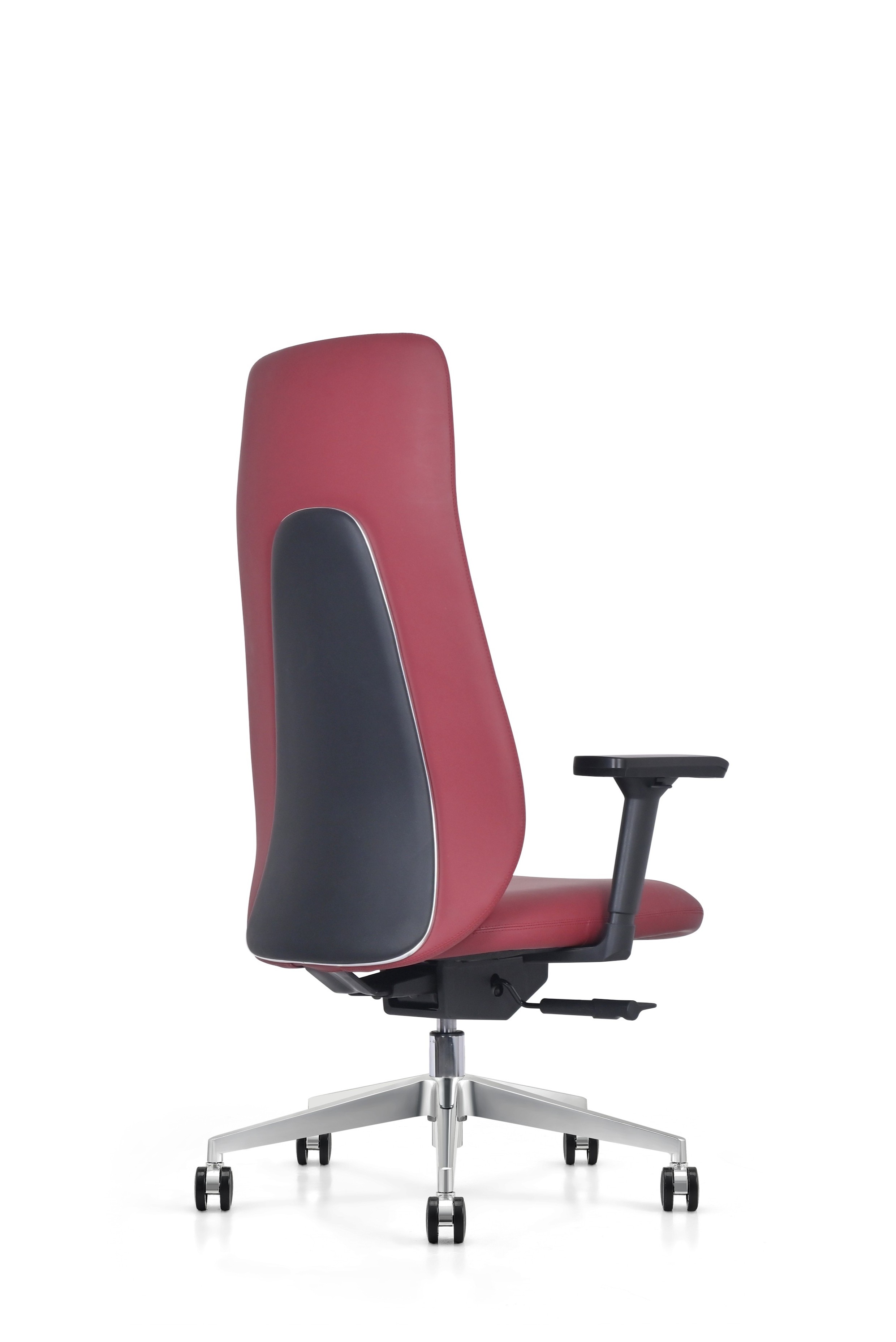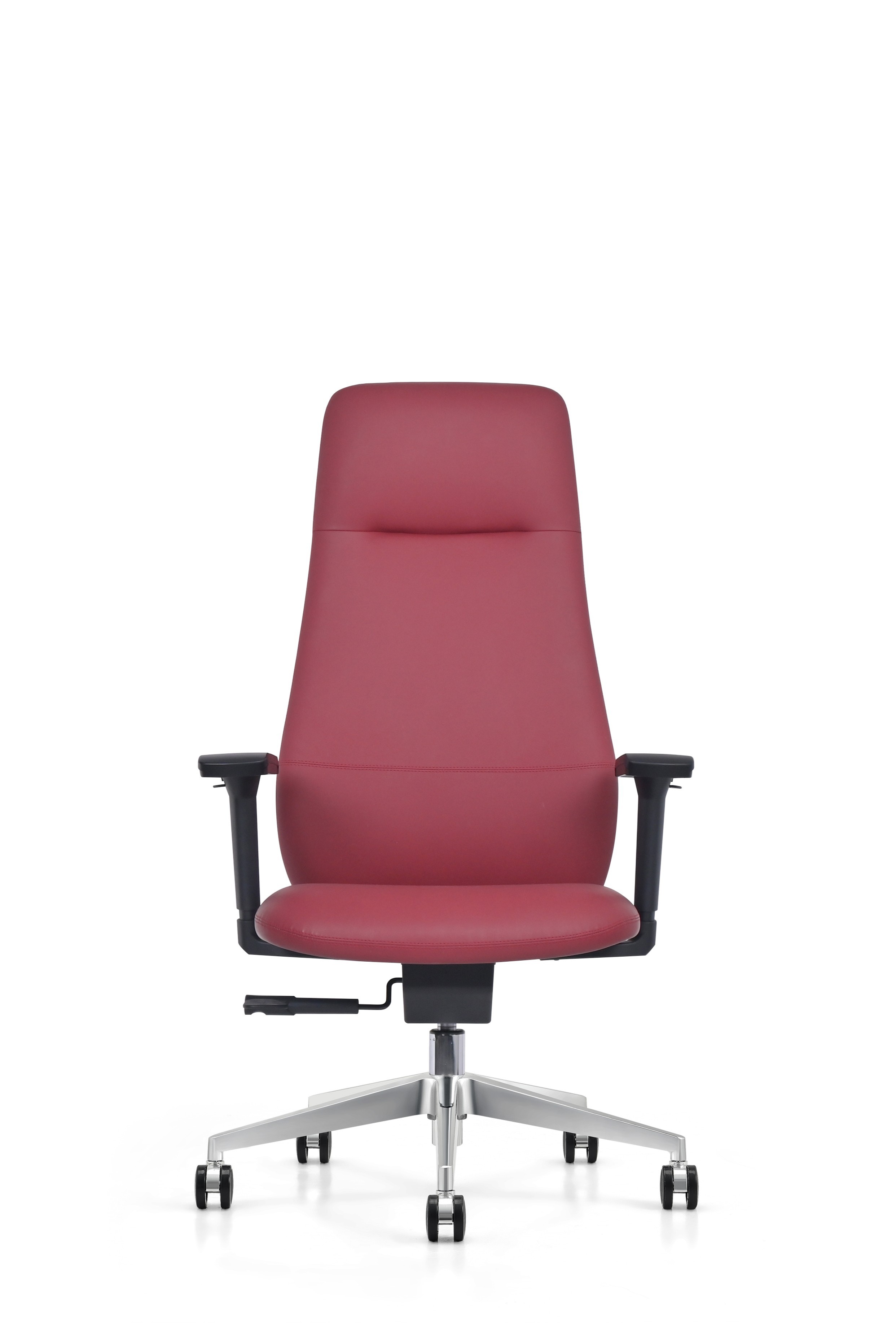 Premium high-back executive chair featuring red upholstery, black adjustable armrests, polished aluminum base, and ergonomic design for executive offices.