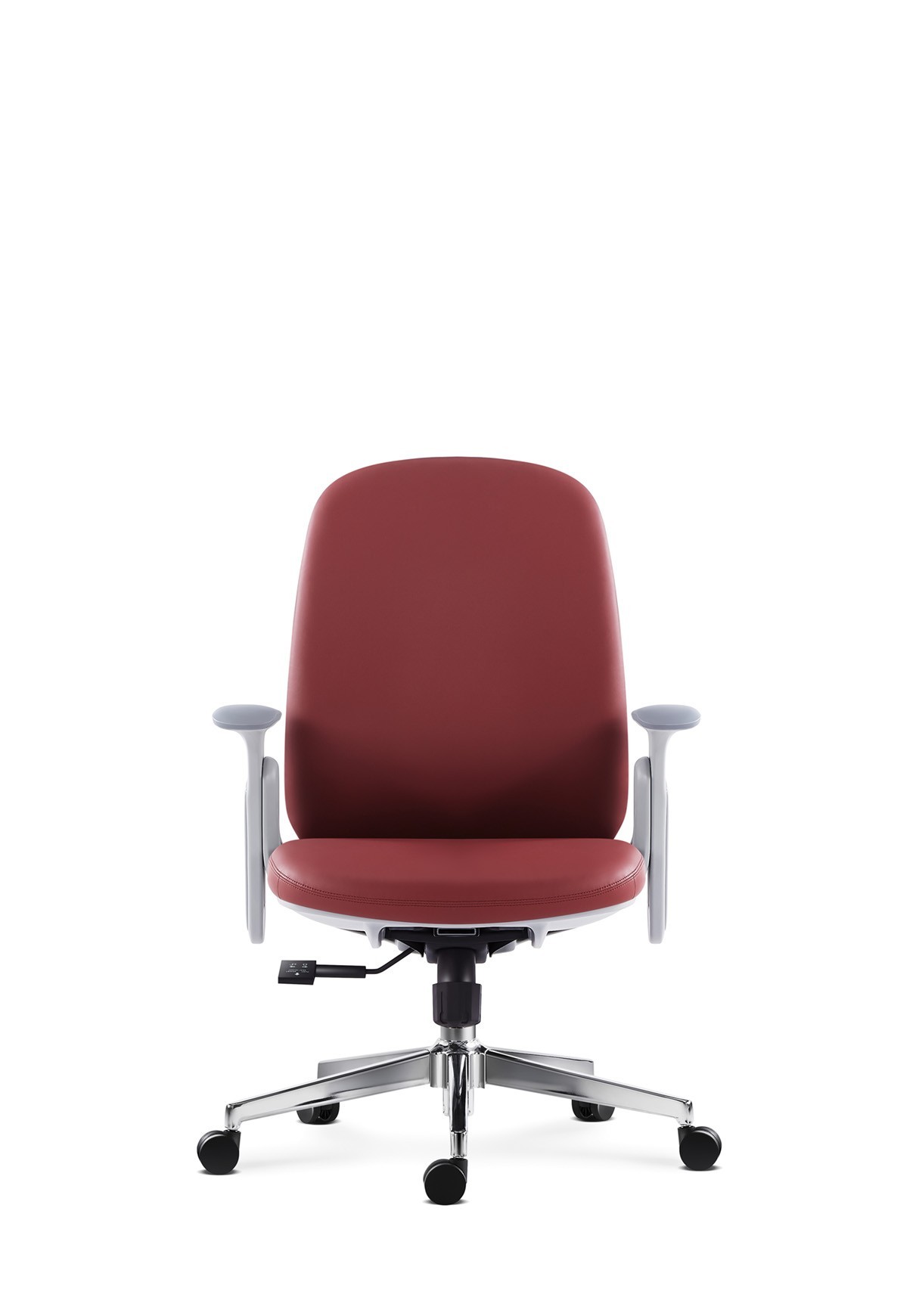 Professional task chair featuring leather upholstery, mid-back design, white adjustable armrests, chrome base, and ergonomic comfort features.