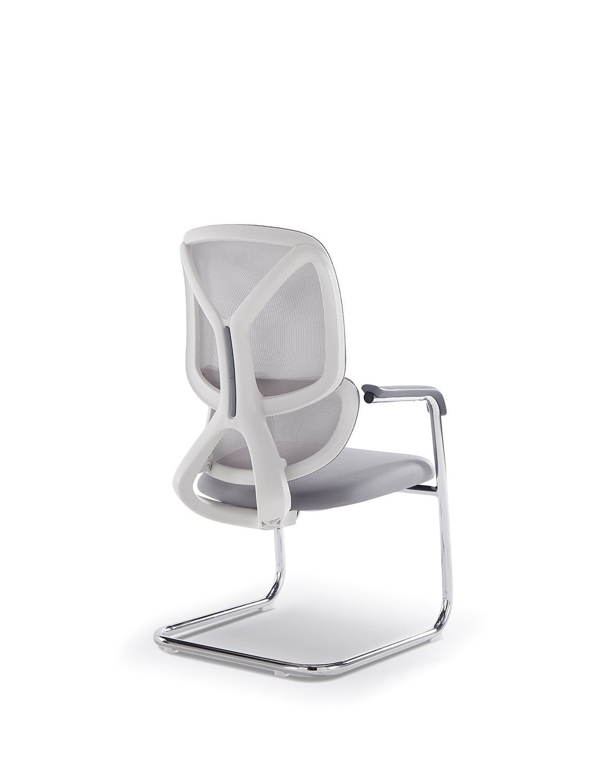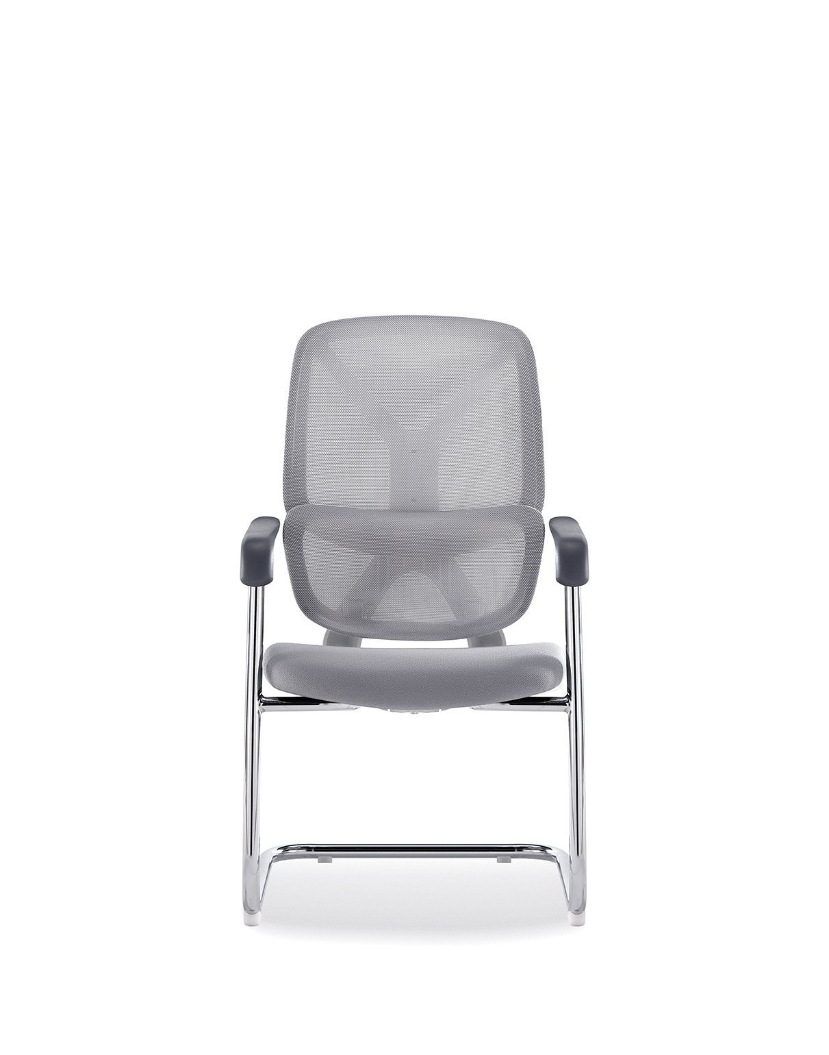 Stylish cantilever guest chair with breathable mesh back, chrome steel frame, padded seat, fixed armrests, and stationary base for visitor seating.