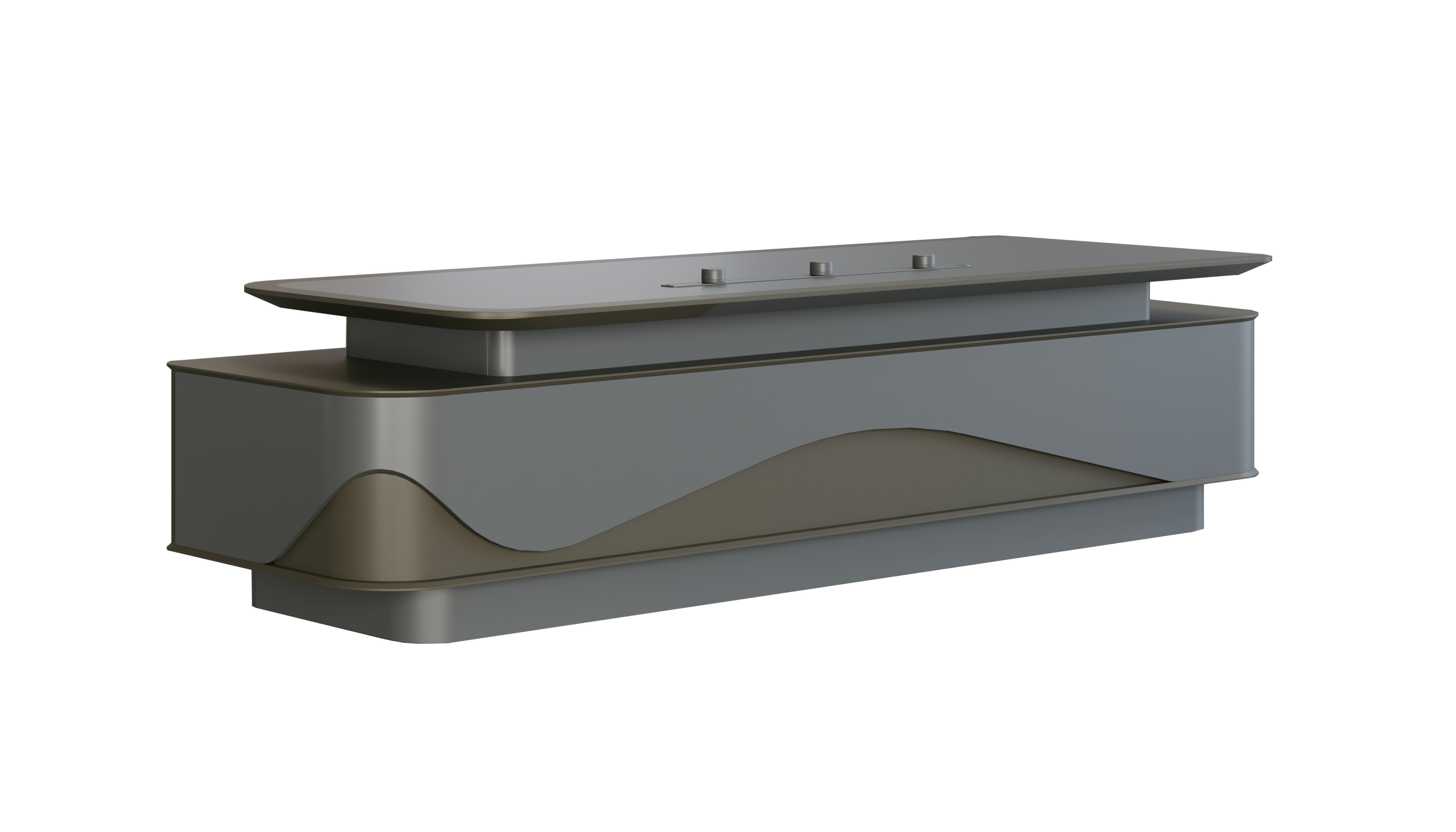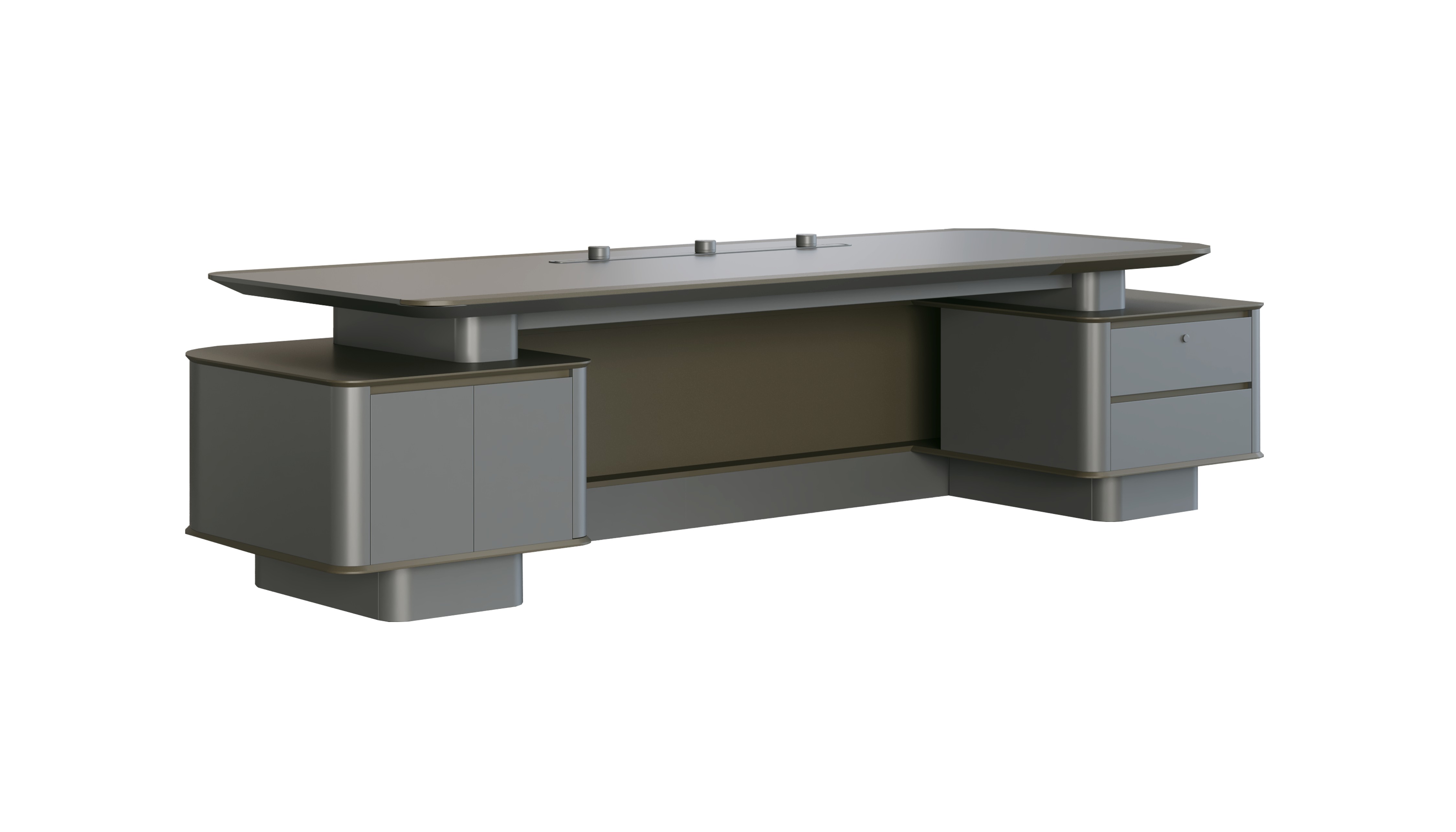 Luxurious executive desk featuring dual side pedestals, spacious work surface, integrated storage compartments, and sophisticated gray finish design.