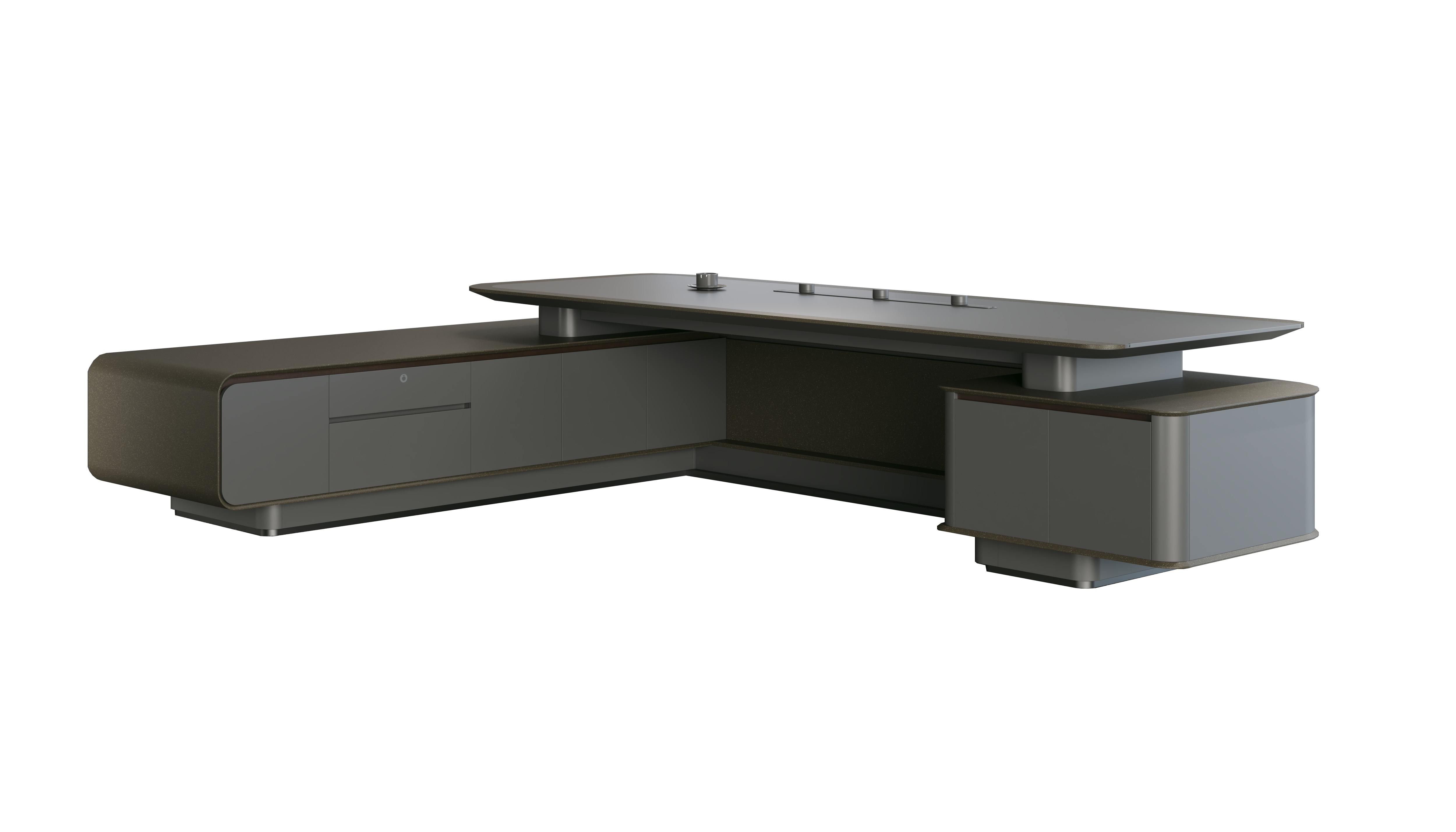 Premium L-shaped executive desk with dual pedestals, curved design, integrated storage compartments, and sophisticated gray professional finish.