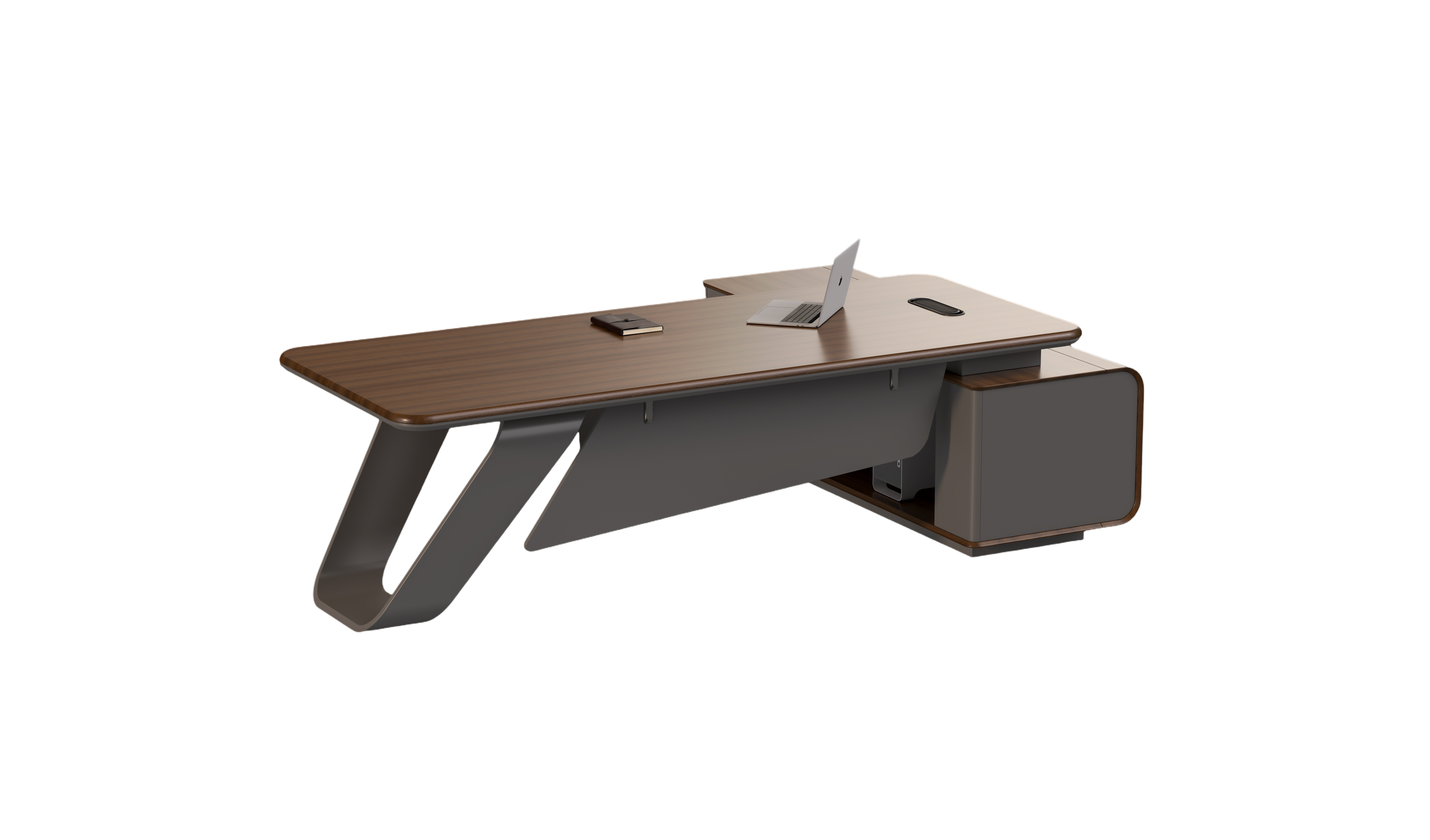 Modern executive L-shaped desk featuring distinctive angular metal legs, integrated storage credenza, and rich walnut finish design.